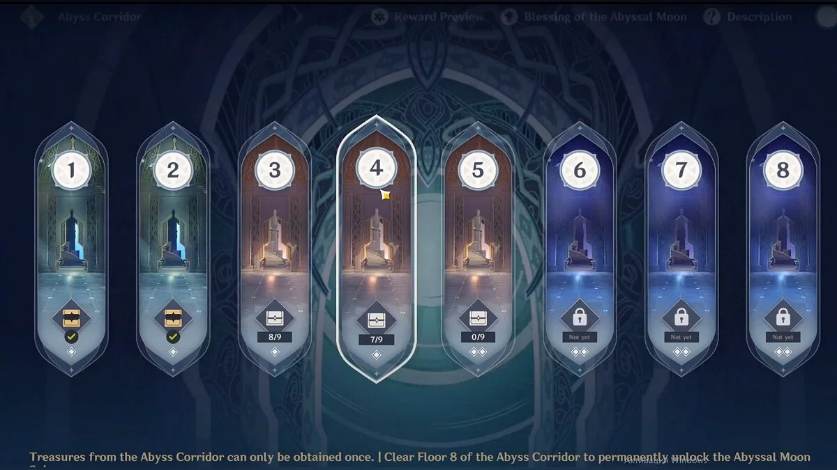 Витая бездна состоит из двух больших частей — «Коридоры Бездны» (1-8 этаж) и «Лунная спираль» (9-12 этаж). Вы будете получать награду за прохождение каждого этажа. Для «Коридоров бездны» она составляет 60 000 моры и 300 камней истока, для «Лунной спирали» — 60 000 моры и 150 камней истока. Один этаж состоит из 3-х залов.