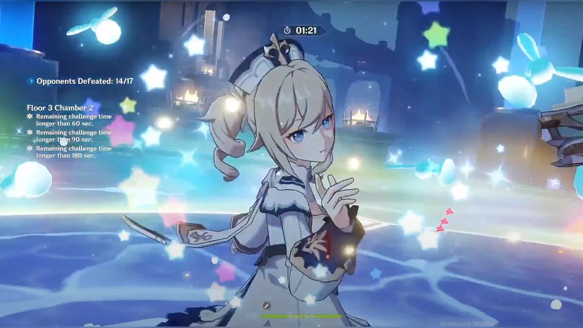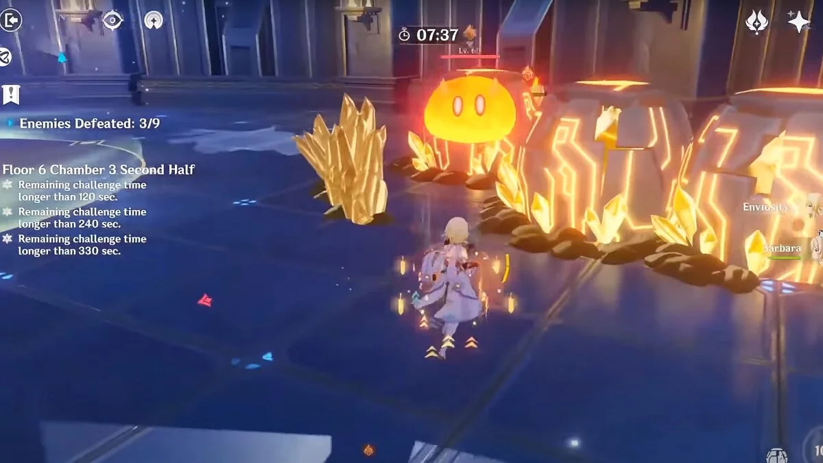 - 3-й зал. Самый лучший бонус — повышение атаки на 20%. Атакуйте огненного агента Фатуи водой или льдом. В этом случае вы сможете обнаружить его, когда он станет невидимым. Для защиты от элементальных атак используйте гео-персонажа, чтобы вызвать «Кристаллизацию».