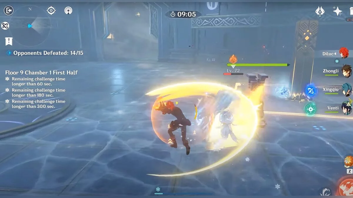 - 2-й зал. Перед началом боя увеличьте урон элементальных навыков на 20%. Во время боя с похитителями сокровищ сочетайте эффекты электричества и воды (Гидро), чтобы вызвать эффект «Заряд», который наносит постоянный электро-урон.
