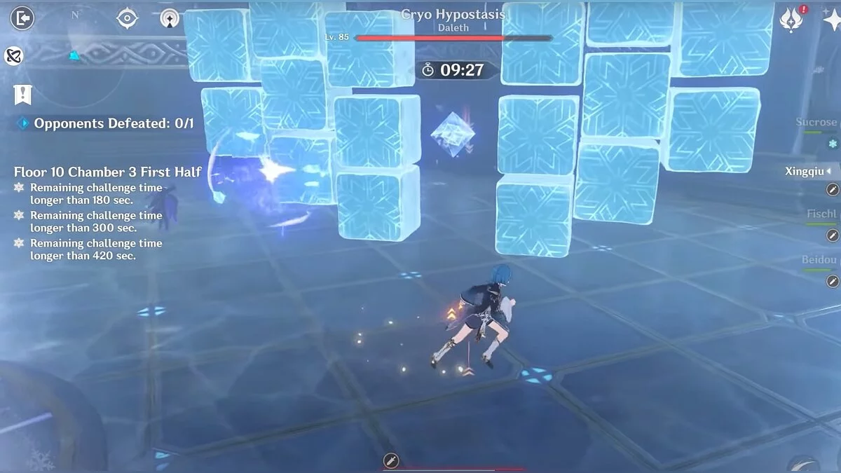 - Зал 3. Из бонусов возьмите увеличение урона от элементальных навыков персонажа на 20%. Во время сражения с крио гипостазисом атакуйте его огненными заклинаниями в сочетании с магией воздуха (Анемо). Когда он начнёт бросаться кристаллами, бейте их заряженными атаками. Как только щит спадёт — босс окажется уязвим. Во время сражения с лавачурлом и гидро магом бездны старайтесь бить их по одиночке, чтобы не подвергнуться заморозке.