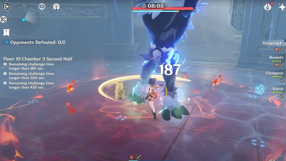 - 1-й зал. В качестве бонуса стоит выбрать увеличение шанса критического попадания на 8%, а урон от такой атаки — на 15%. Во время сражения, помимо базовых ударов мечом или копьём, полагайтесь на «Рассеивание», которое возникает при сочетании стихий воздуха (Анемо) с водой (Гидро), льдом (Крио) или огнём (Пиро). Следите за шкалой здоровья — она не должна падать ниже 50%, иначе вы потеряете бонус к силе атаки.