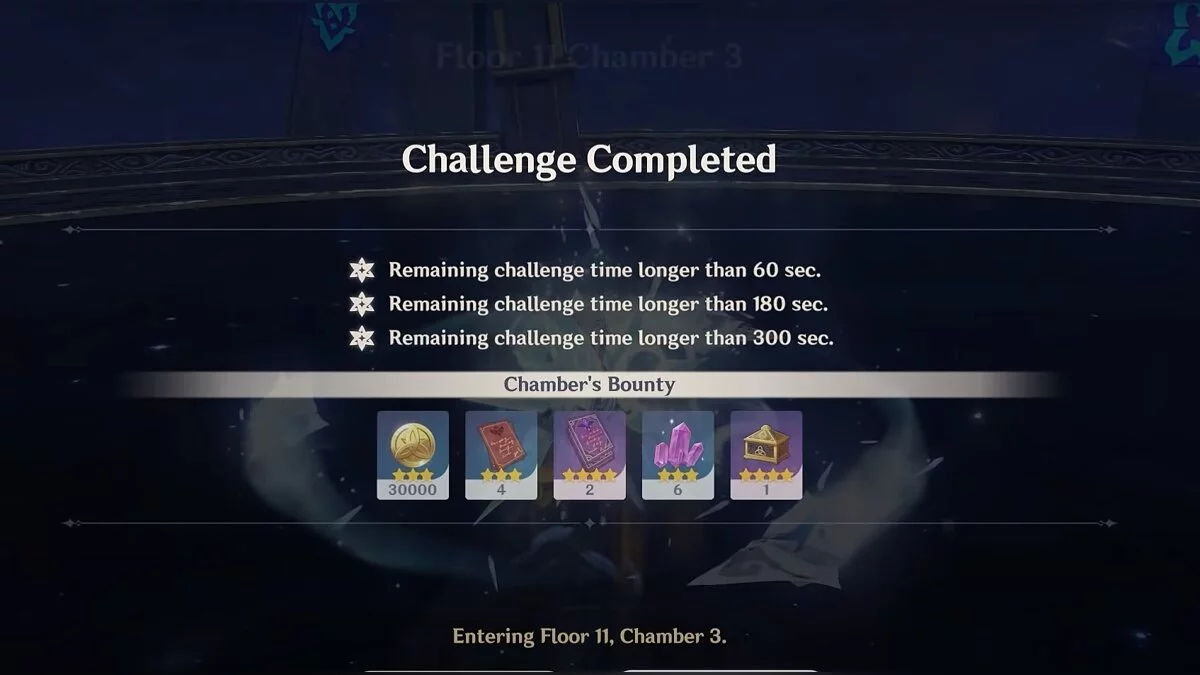За прохождение каждого зала вы получите 10 000 моры, 6 очков опыта приключений, 4 единицы волшебной руды усиления, 5 очков опыта странника и артефакт из наборов «Изгнанник», «Инструктор» или «Берсерк».