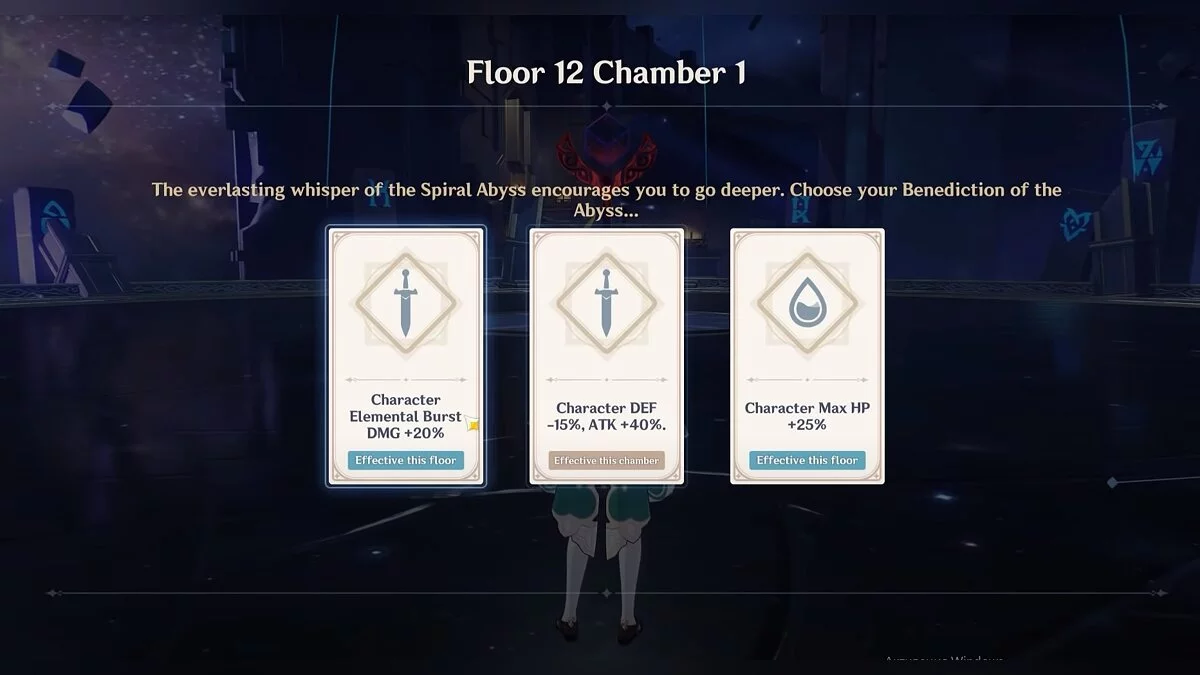 - 2-й зал. Перед началом сражения отличным выбором будет получить 50%-ный шанс восстановить откат элементального навыка при победе над противником. Тактика боя точно такая же, как в 1-м зале.