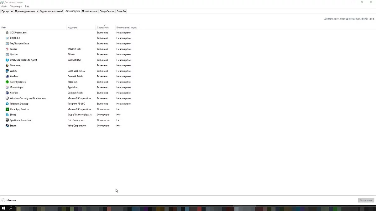 Также стоит почистить автозагрузку. Перейдите на одноименную вкладку в «Диспетчере задач» и выключите все ненужные программы. Когда их слишком много, то оперативная память и ресурсы процессора расходуются впустую.