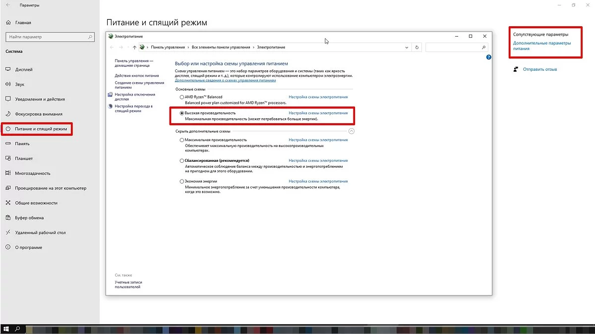 Зайдите в параметры Windows через сочетание Win + I и перейдите в пункт «Система». Далее выберите «Питание и спящий режим». В правой части экрана нажмите на ссылку «Дополнительные параметры питания». Затем выберите режим «Высокая производительность». Можно выбрать режим максимальной производительности. О том, как это сделать читайте в нашем материале «Как настроить Windows 10 для игр».