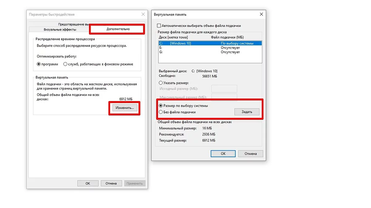 Файл подкачки и оперативная память. Если на ПК не хватает оперативной памяти, то игры могут подтормаживать. Это происходит потому, что система обращается к файлу подкачки, который расположен на более медленном, чем ОЗУ, накопителе. Именно из-за этого и происходят просадки производительности. Решение тут простое — увеличить объем оперативной памяти. Также можно попробовать увеличить объем файла подкачки и перенести его на SSD. В поиске Windows введите «Настройка представления и производительности системы». Вам нужна вкладка «Дополнительно», далее «Виртуальная память». Нажмите кнопку «Изменить».