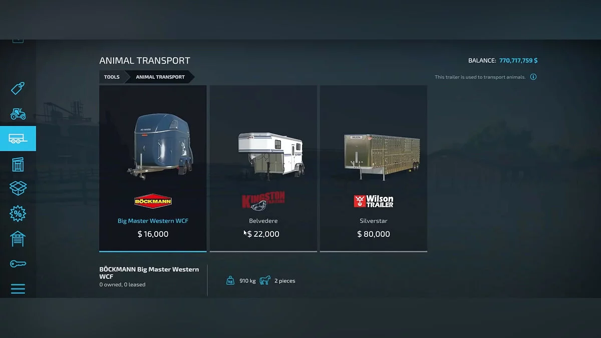 Теперь пора купить животных. Сделать это можно несколькими способами. Первый — приобрести трейлер для живности и съездить к ближайшему продавцу. Откройте карту, чтобы найти подходящего. Этот способ займет немало времени, зато вы купите необходимых питомцев без наценки. Обратите внимание, что трейлер вмещает ограниченное число зверей.