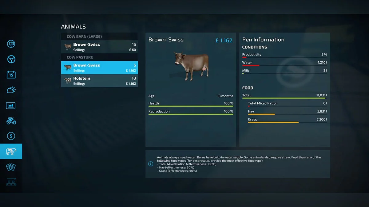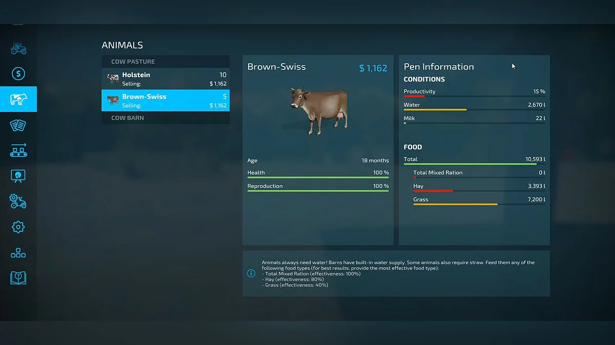- Вода/Солома — показатель, зависящий от места жительства коров. В открытых загонах нужна вода, в сараях — солома;