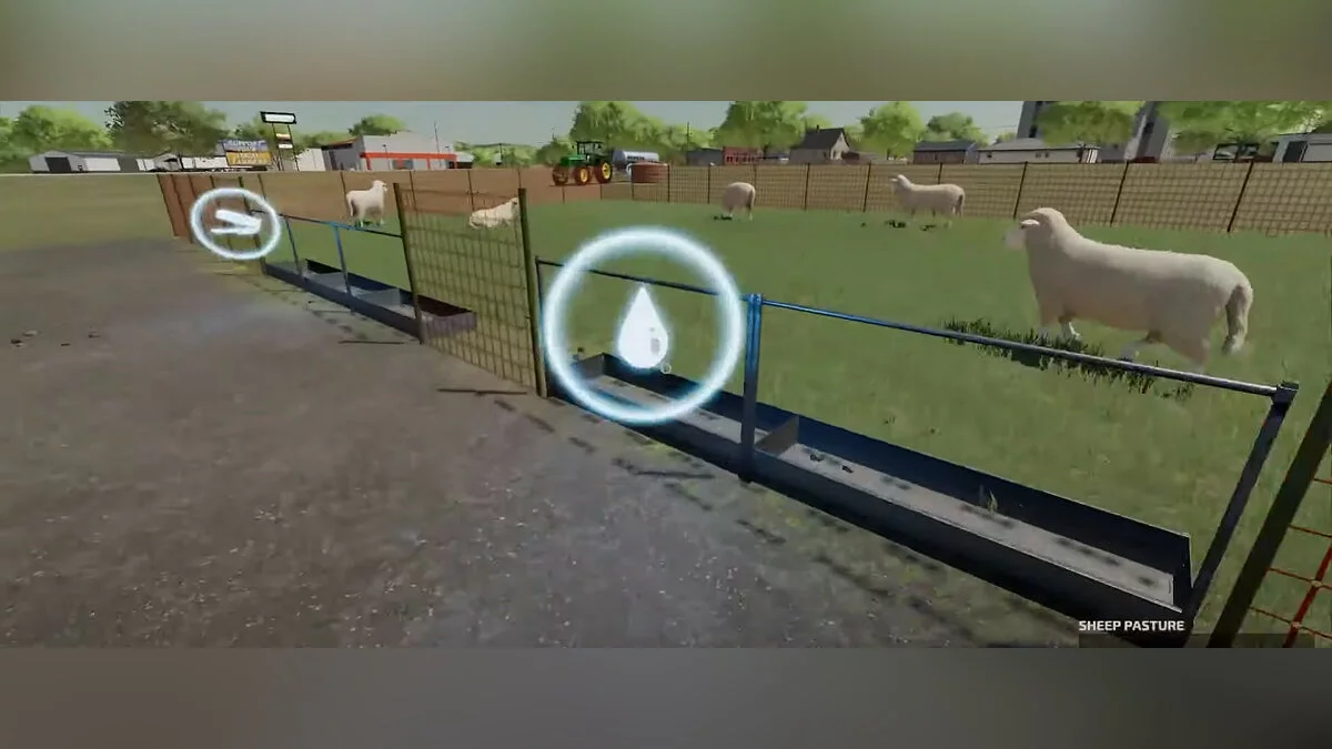 Значок воды рядом с загонами означает поилки. Здесь вам потребуются передвижные цистерны. Их также можно купить в магазине, но придется наполнять водой. Ее можно приобретать за деньги, или бесплатно наливать в водоемах. Постройте подземное хранилище на своем участке, чтобы наполнять цистерну сразу на месте. Есть минус — за воду придется постоянно платить. В водоемах все бесплатно, но вы тратите время на поездку. Наполнив цистерны, подъезжайте к значку воды и выливайте содержимое по аналогии с кормом. Еще раз повторимся — в закрытых сараях вода пополняется автоматически.