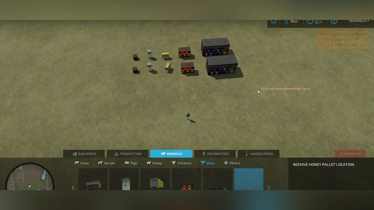 Пчелы — самая простая живность на вашей ферме. Достаточно купить улей, и насекомые поселятся в нем автоматически. Пчелы не только производят мед, но и опыляют ваши поля. Поэтому ульи делятся не только по размеру и количеству живущих в них насекомых, но и по охвату опыления — от 25 до 150 метров.