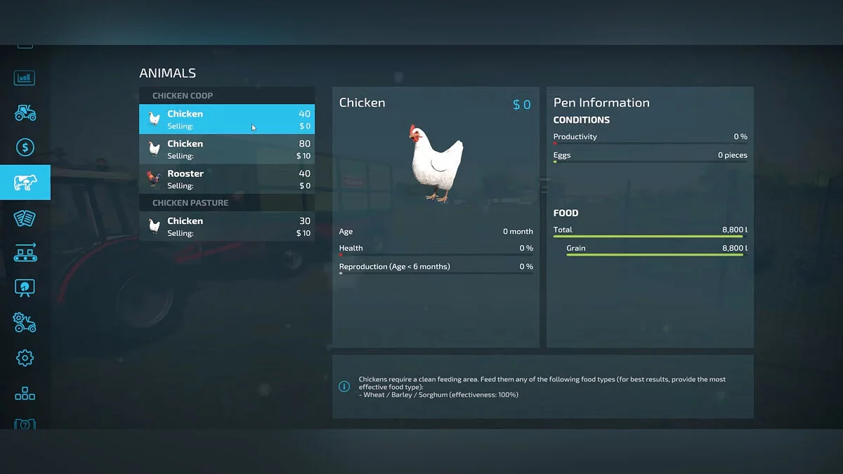 Характеристики еды меняются в зависимости от вида — кому-то подходит обычное зерно, другим же надо комбинированное питание. Обратите внимание, что внизу окна с параметрами животного можно найти информацию о необходимой еде и проценты ее эффективности. Это поможет не забыть кого чем кормить. Сконцентрируйтесь на выращивании и покупке сорго — это основная растительная культура, которая чаще всего используется для питания.