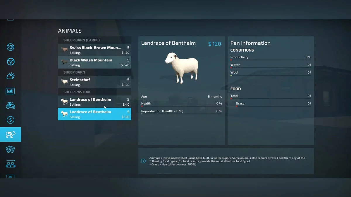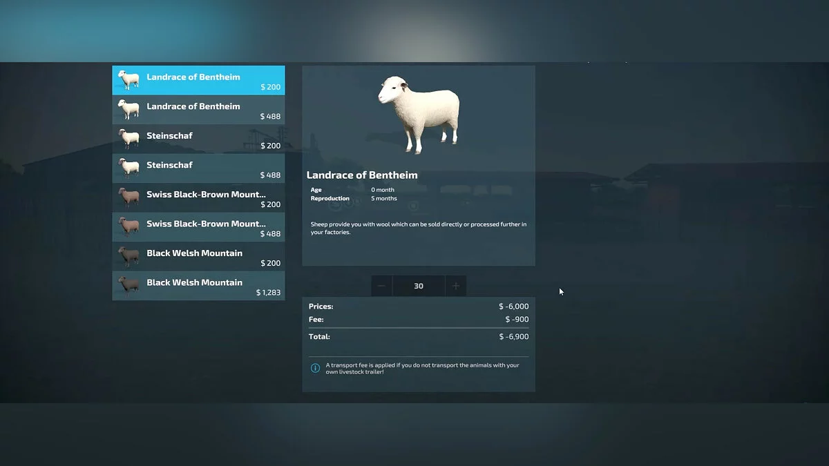 Выбрав загон, необходимо купить животных. Породы не имеют значения — все овцы дают только шерсть.