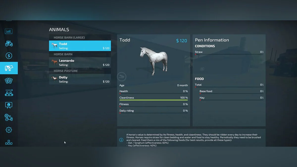 Сразу после покупки практически всё будет находиться на нуле. Не пугайтесь низкого здоровья — смерть скота возможна, но далеко не сразу. При низком уровне жизни вы не получите с животных продукты их жизнедеятельности, а значит прибыль. Повышая все показатели, вы автоматически будете увеличивать здоровье. Для этого за животными необходимо ухаживать — чистить, или гулять. Однако для большинства характеристик достаточно обеспечить водой, подходящей едой и местом для сна.