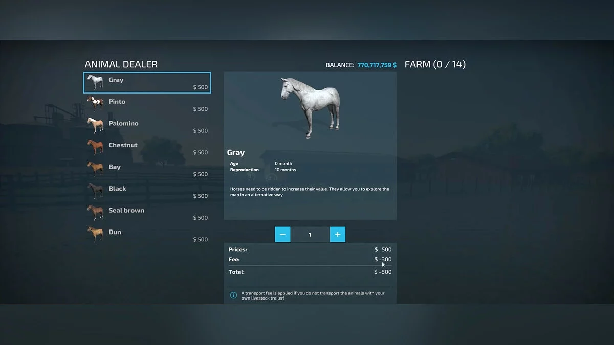 Выбрав постройки, переходите в магазин животных. Лошади различаются только по цвету, поэтому выбирайте, руководствуясь собственными предпочтениями.