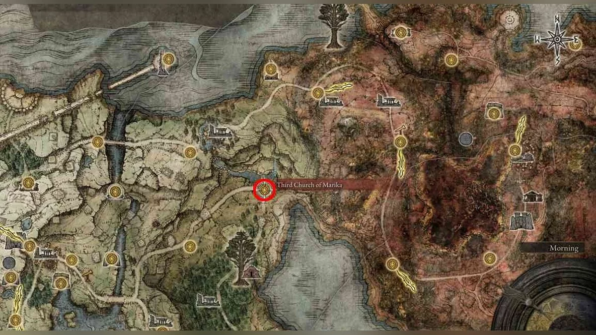 Священная слеза №1. Отправляйтесь в Лимгрейв — Третий храм Марики (Limgrave — Third Church of Marika). Когда окажетесь у места благодати, посмотрите на север. Вы должны увидеть статую. Слеза лежит у её подножия.