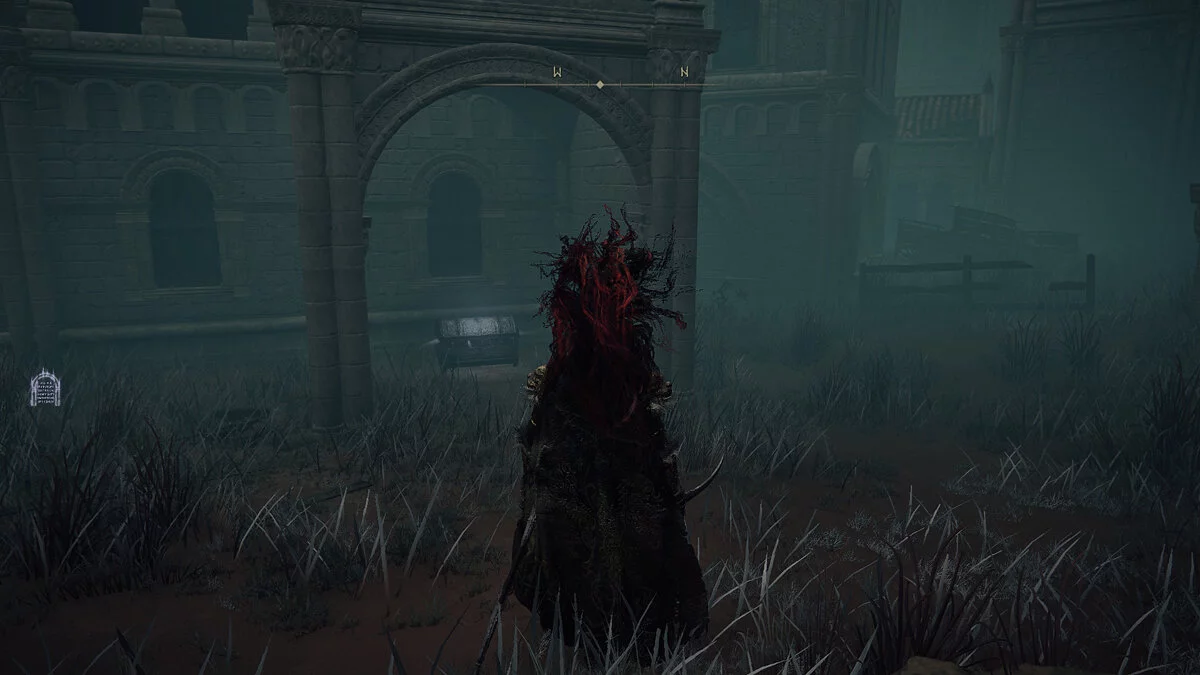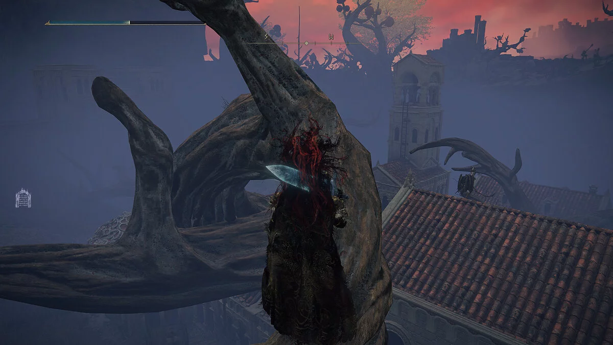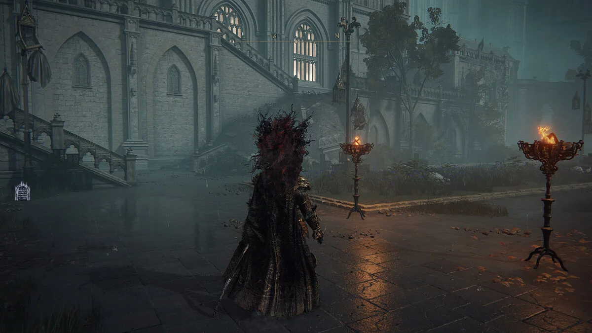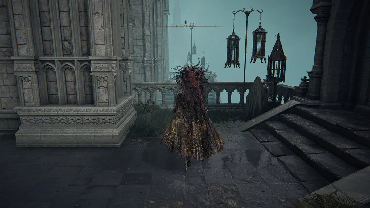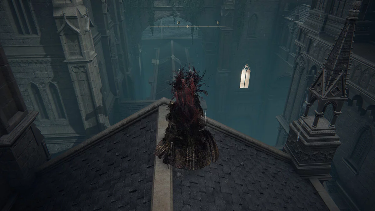 Выходите из здания на север. Добравшись до внутреннего двора, поверните налево и взберитесь по щебню у дальней стены. Затем продолжайте подниматься по лестнице мимо врагов, использующих магию, и перепрыгните через перила слева на лестницу внизу. Продолжайте подниматься по короткому лестничному пролёту и поверните налево за угол, мимо ещё одного волшебника. Снова перепрыгните через перила на крышу.