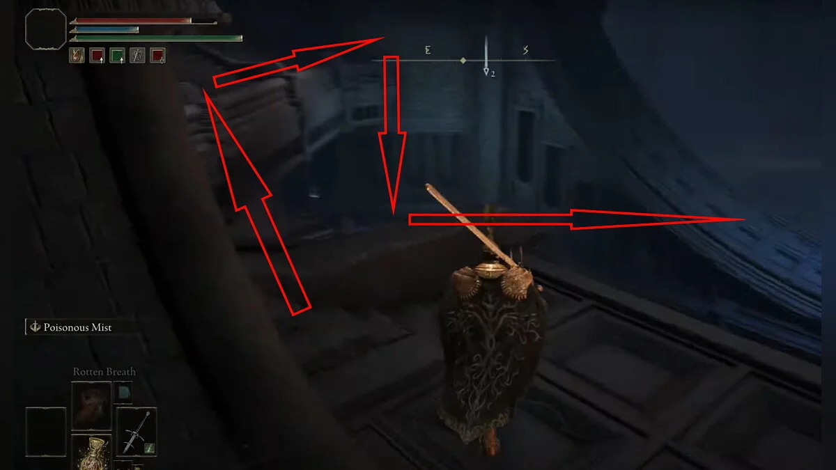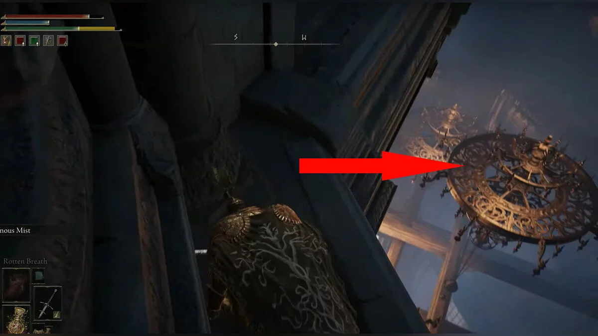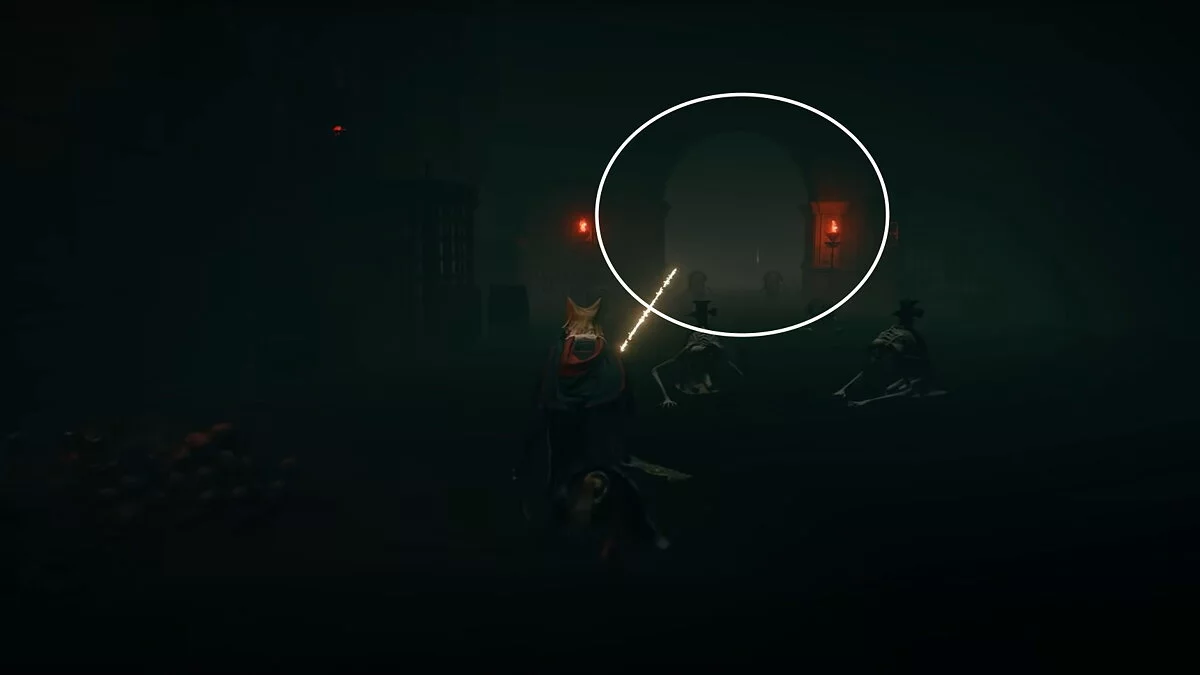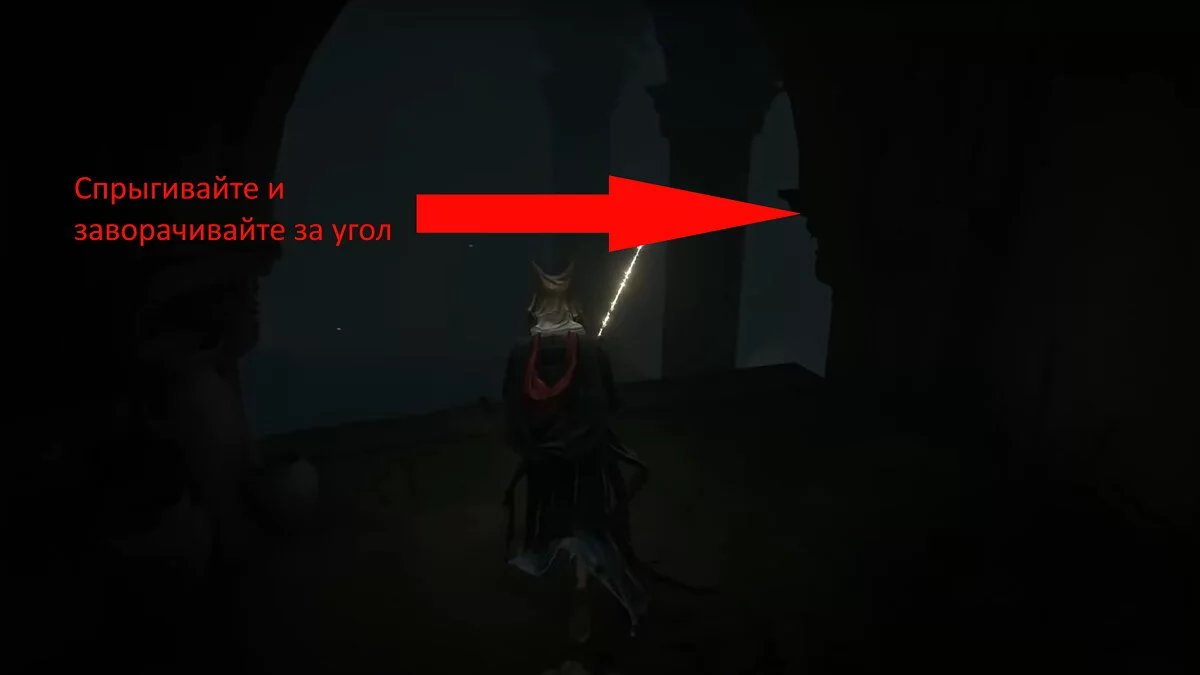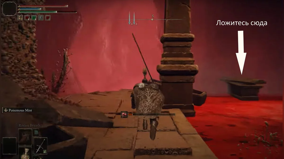 Возвращайтесь к месту благодати «Побережье озера Гнили», которое вы открыли после победы над призраком Блайда. Вам нужно перебежать на другую сторону водоёма. Ориентируйтесь по арке с двумя статуями. Используйте памятники, чтобы создавать безопасные мостки, где не накапливается красная гниль. При помощи кувырков вы будете передвигаться по озеру быстрее. Активируйте место благодати на другом берегу.