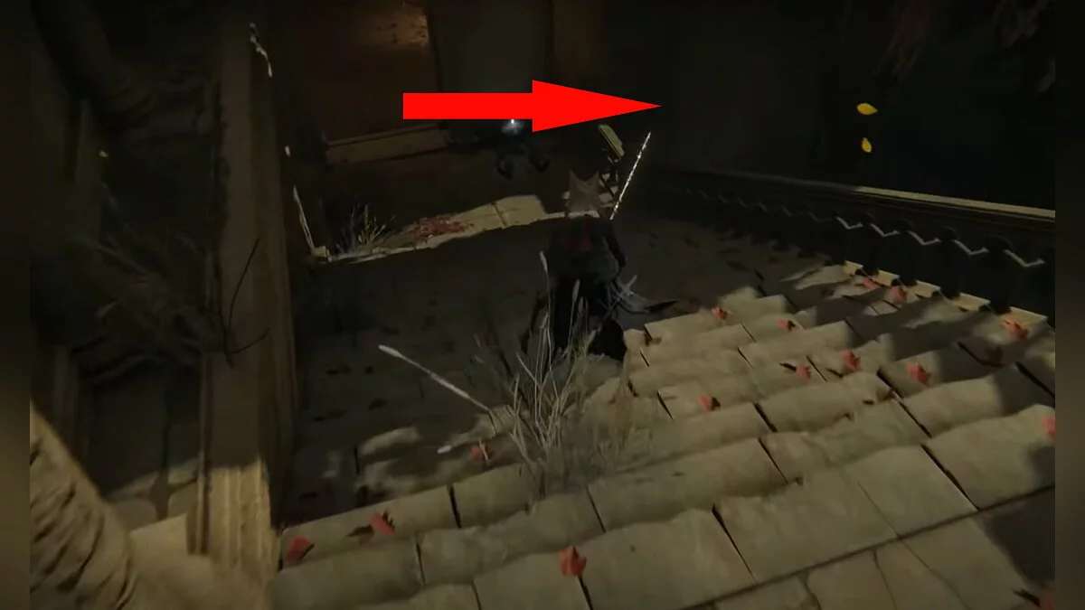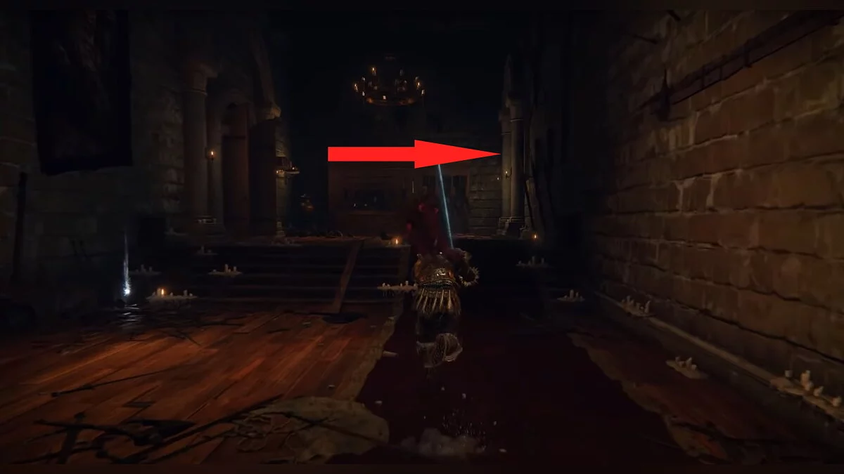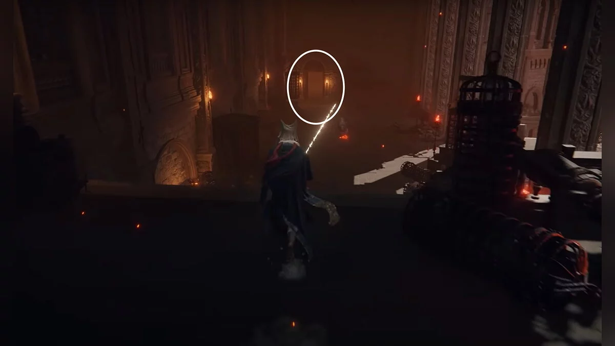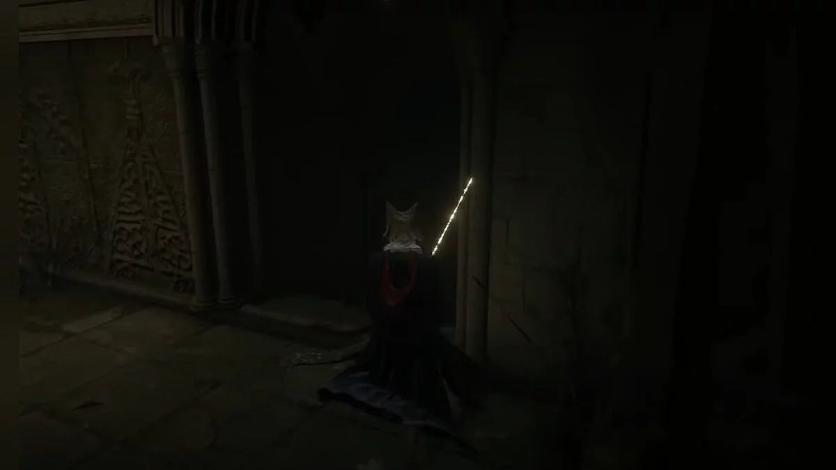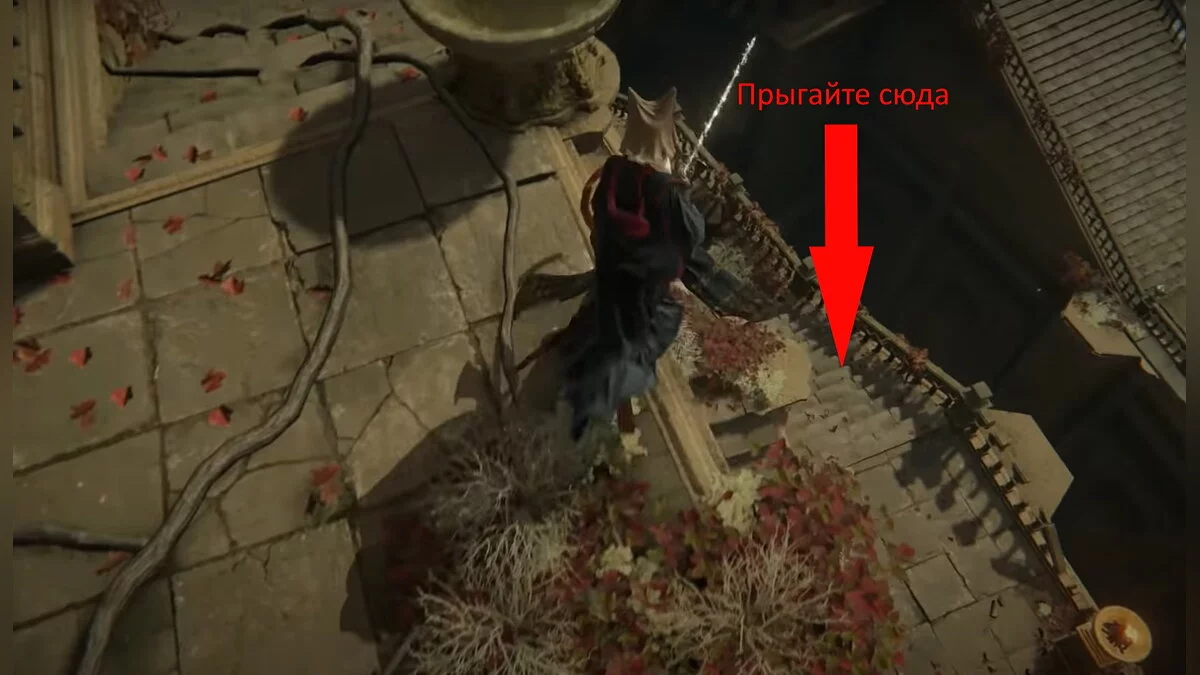 Бегите вперёд до обрыва, после чего аккуратно спускайтесь вниз по балкам и камням. Когда вы окажетесь на полу, он провалится. Активируйте место благодати. Затем подойдите к стене из плоти, снимите с себя всю одежду и откройте дверь.