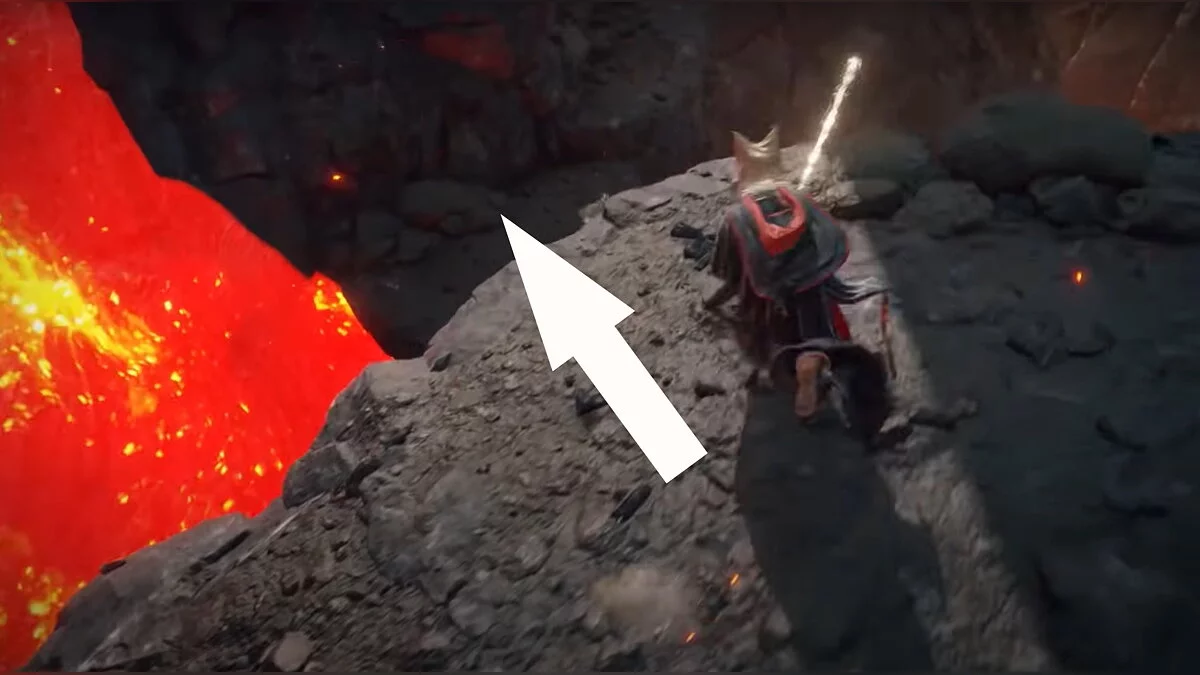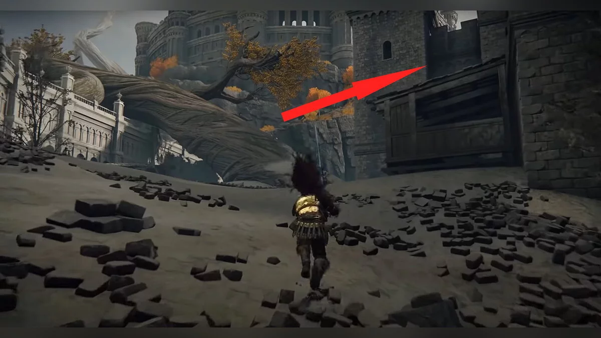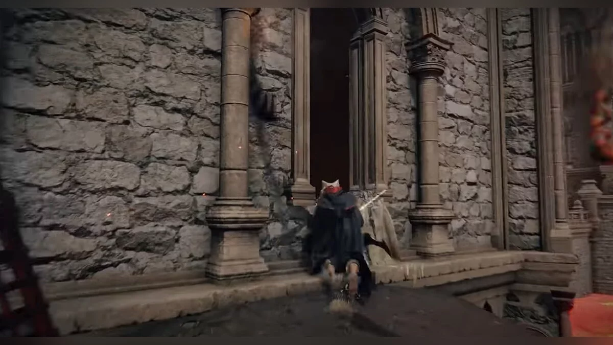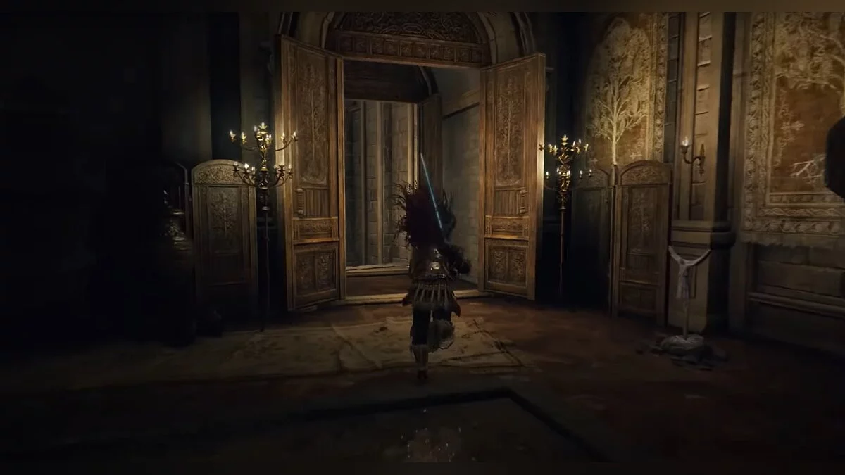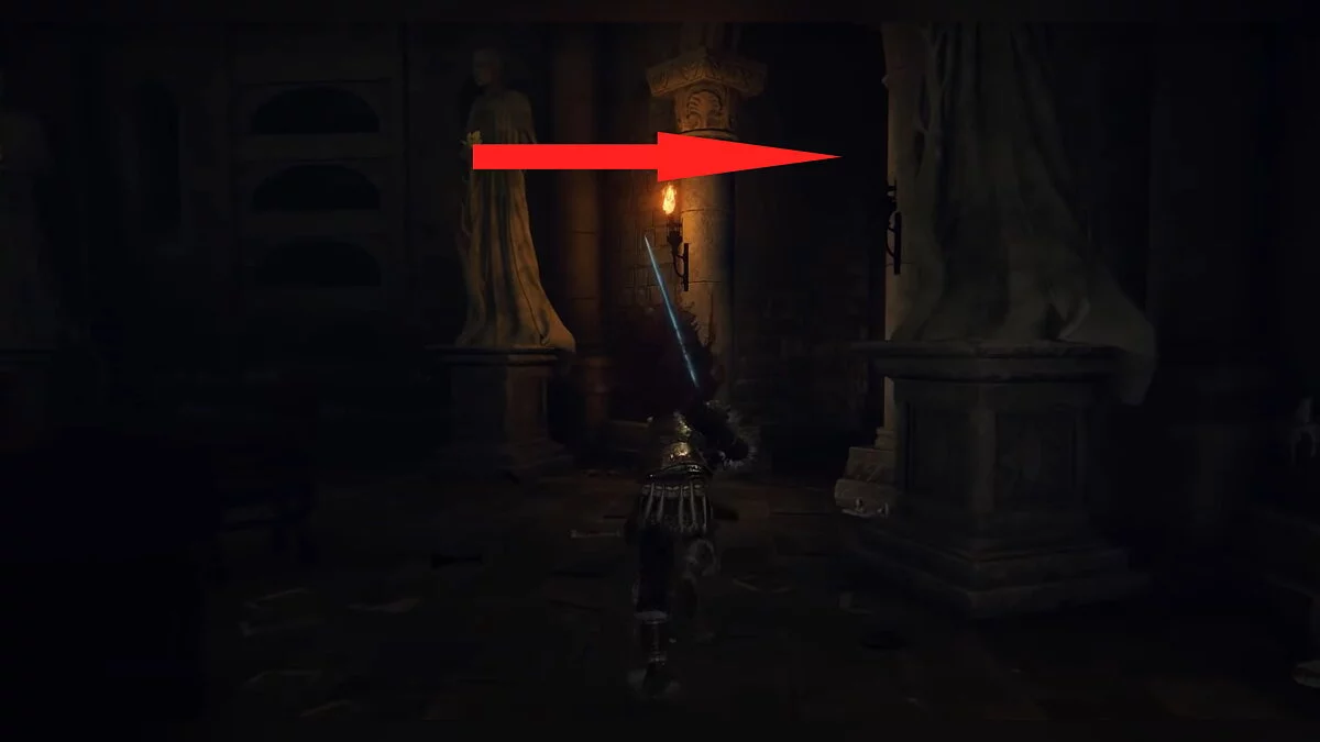 Бегите вперёд до обрыва, после чего аккуратно спускайтесь вниз по балкам и камням. Когда вы окажетесь на полу, он провалится. Активируйте место благодати. Затем подойдите к стене из плоти, снимите с себя всю одежду и откройте дверь.