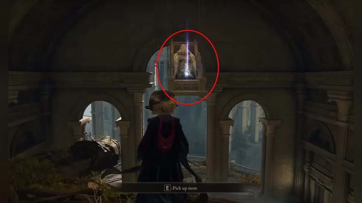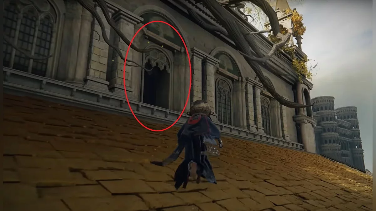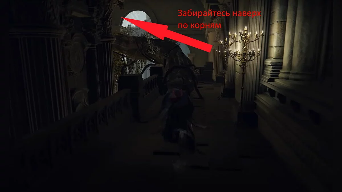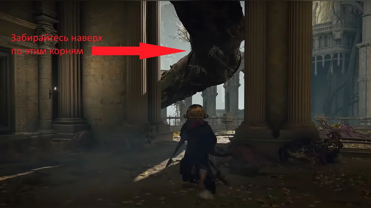 От места благодати заберитесь наверх по корням и обойдите здание справа. Забирайтесь в окно и по ветке лезьте ещё выше. Ориентируйтесь по нашим скриншотам. В центре комнаты висит стул, на котором сидит человек. У него нужно забрать «Основы Золотого порядка».