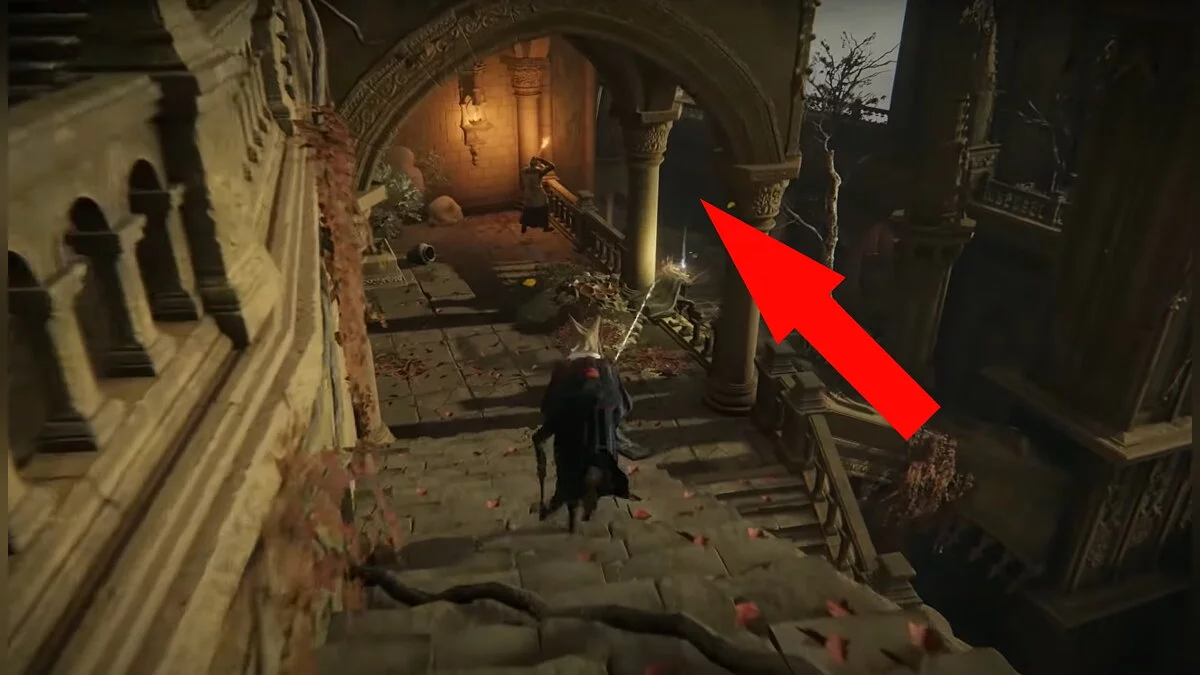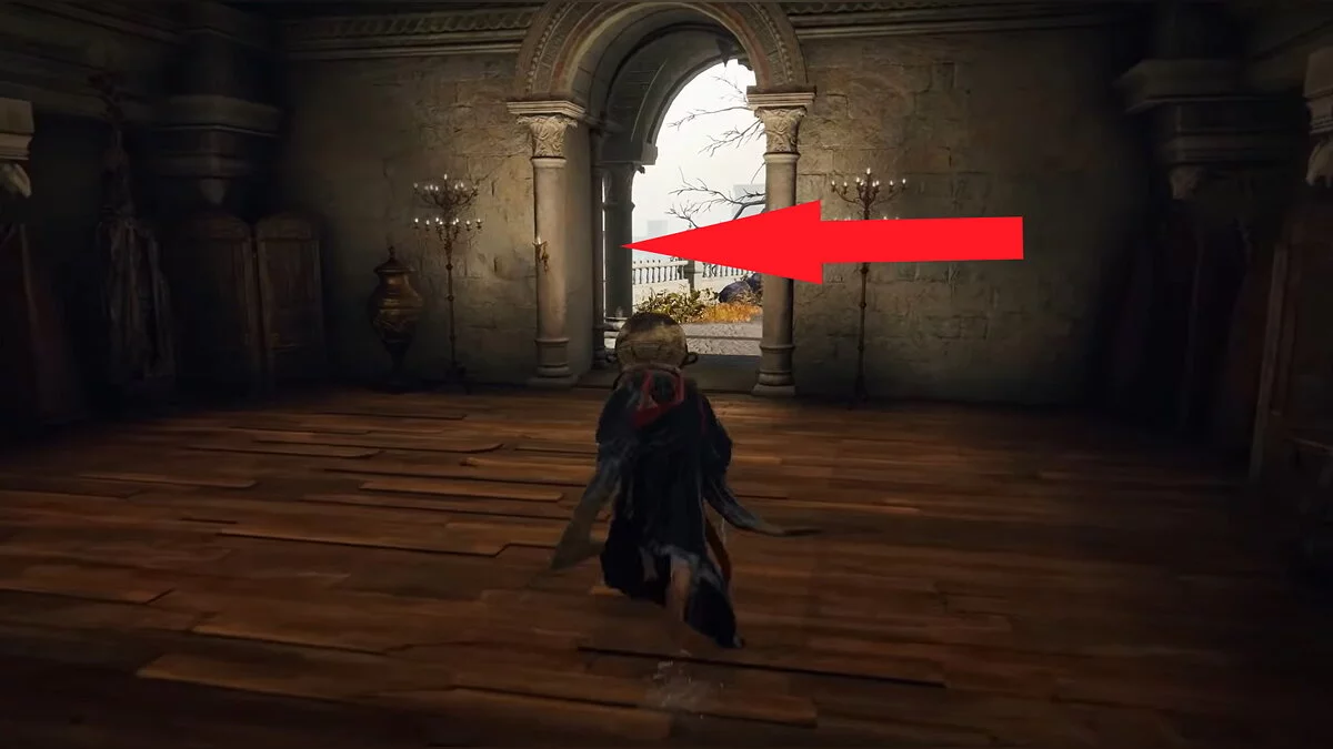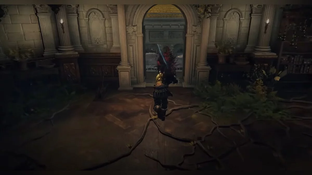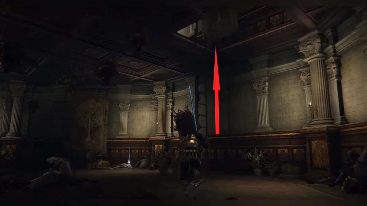 От места благодати заберитесь наверх по корням и обойдите здание справа. Забирайтесь в окно и по ветке лезьте ещё выше. Ориентируйтесь по нашим скриншотам. В центре комнаты висит стул, на котором сидит человек. У него нужно забрать «Основы Золотого порядка».