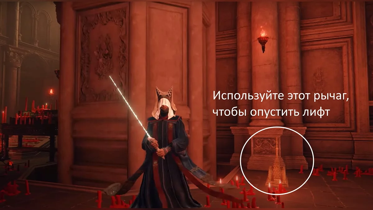 Когда спуститесь, проходите через дверцы и открывайте ворота. Активируйте место благодати и бегите вперёд. Поднимайтесь на лифте наверх и двигайтесь направо по лестнице. Забирайте талисман и знак проклятия.