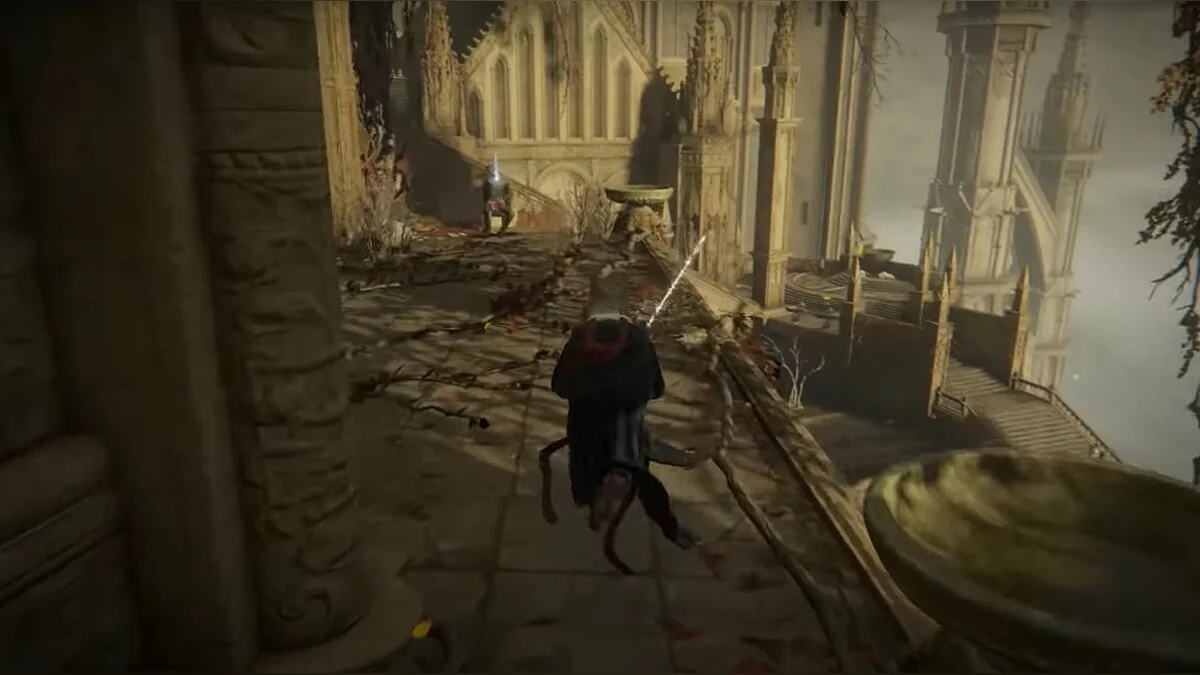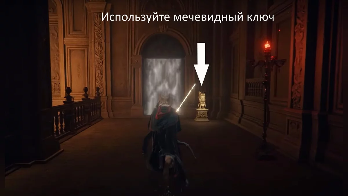 Теперь бегите в здание справа. Аккуратно спускайтесь по склону и заходите. Там находится лифт .Садитесь в него. Двигайтесь вперёд по узкой пещере. Здесь вас ждёт битва с призраком Блайда, которого обязательно нужно одолеть. В качестве награды вы получите ключ. Проходите через арку, спускайтесь на лифте и активируйте место благодати.