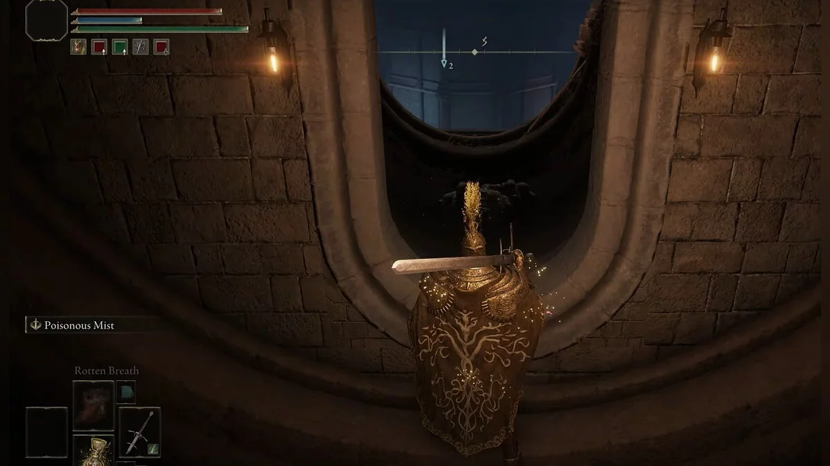 Идите вперёд по ступенькам. Вас ждёт бой с боссом Мог, Знамение. Одолейте его. После победы над ним активируйте место благодати, подойдите к стене, которая находится за сундуком с сокровищем, и ударьте по ней мечом. Таким образом вы откроете секретный проход.