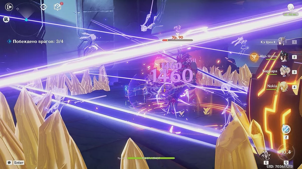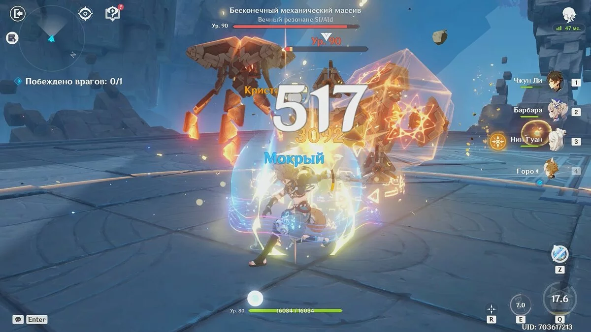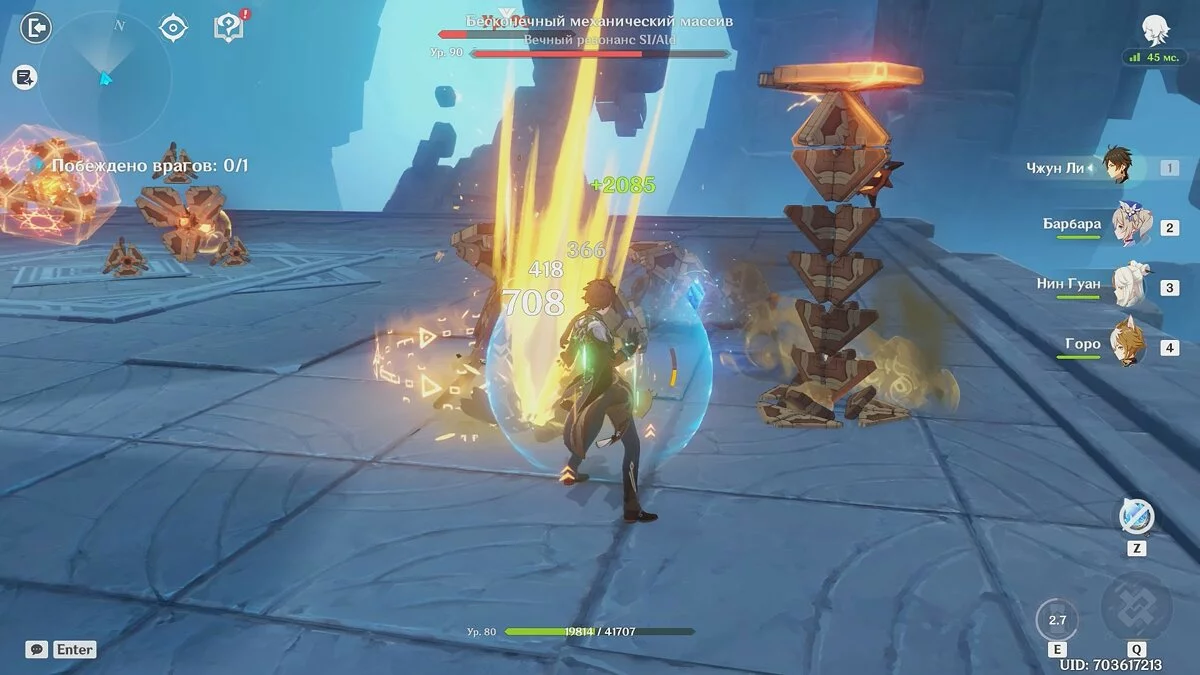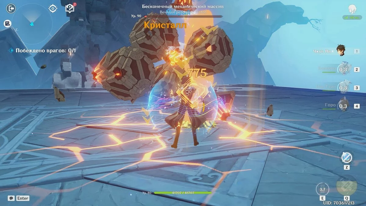 До финального сражения с боссом «Бесконечный механический массив» у вас не должно возникнуть проблем. Используйте элементальные способности гео-персонажей, затем атакуйте несколько раз хилером, чтобы получить кристаллы. Так как щит усилен на 40%, а также наносит урон атакующим врагам, это лучшее решение.