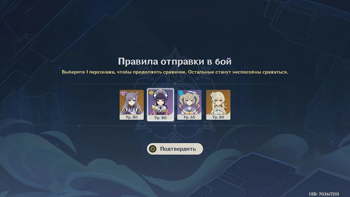 Каких-либо особых советов в этом раунде выделить нельзя. Разберитесь со всеми врагами и переходите к следующему испытанию. Старайтесь чаще использовать элементальные навыки героев и атаковать взрывом стихий Кэ Цин. После победы выберите Кэ Цин, если у вас нет альтернативного героя.