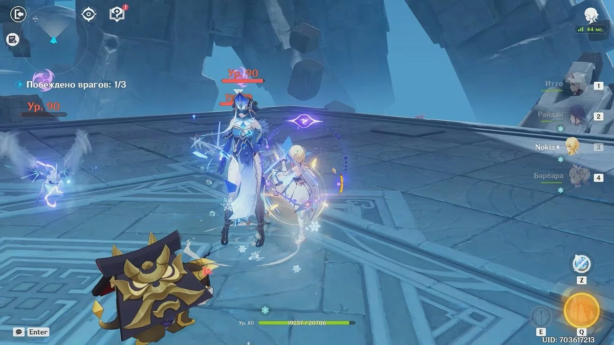 Тактика в этом раунде довольно простая: используйте элементальные навыки и взрыв стихий гео-персонажей чтобы получать кристаллы и игнорировать входящий урон от врагов. С последними противниками эта стратегия не подействует, поэтому здесь пригодится хилер. В нашем случае — Барбара, но вы можете выбрать альтернативного героя на своё усмотрение.