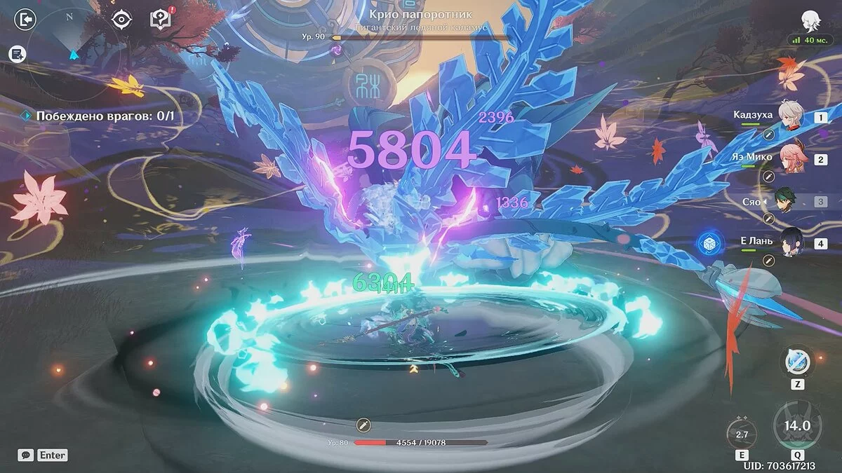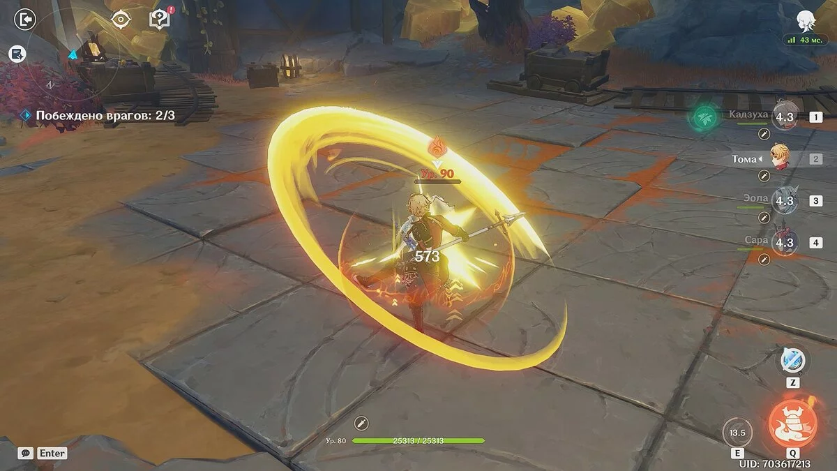Используйте элементальный навык и взрыв стихий Тома, после чего развивайте огонь способностями Кадзуха. Когда умения этих героев будут в кулдауне, атакуйте крио-персонажем и активными навыками Сары. Так как мы выбрали стратагем «Определённость», восстановить здоровье можно обычным переключением героев.