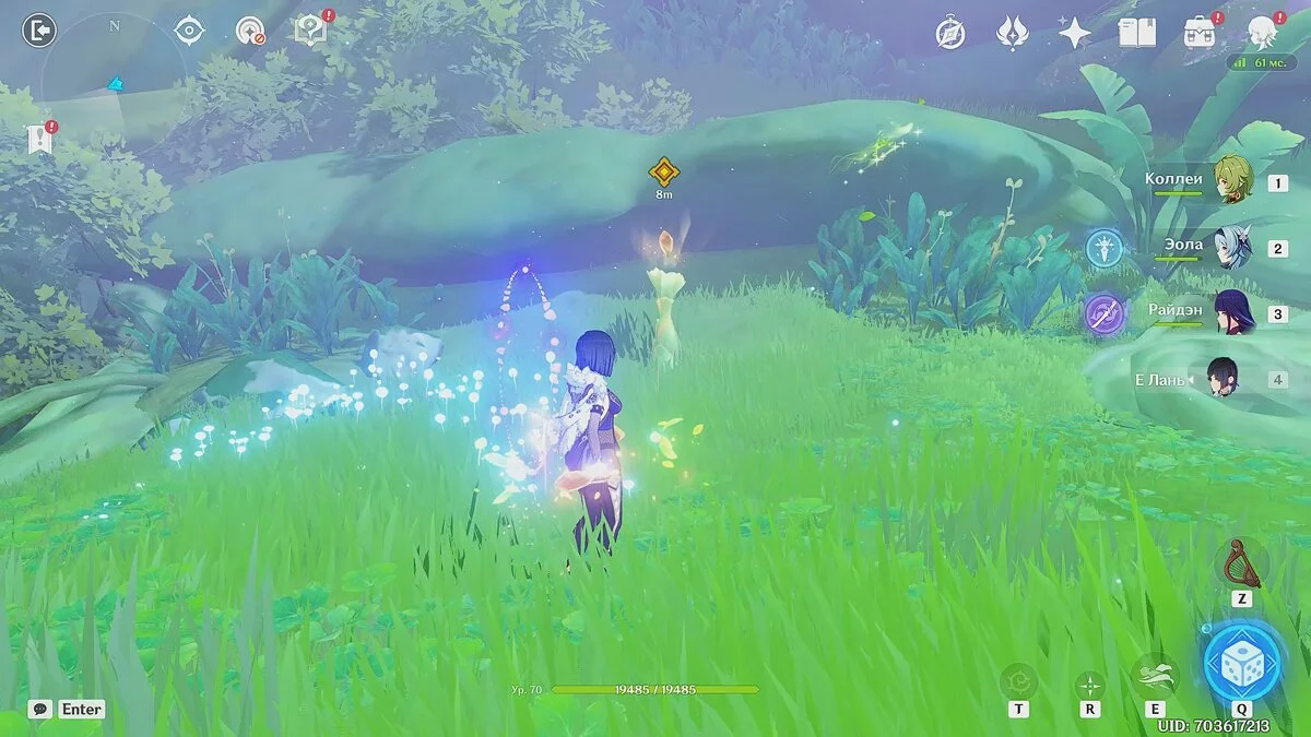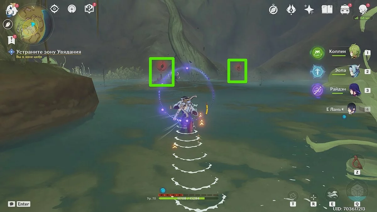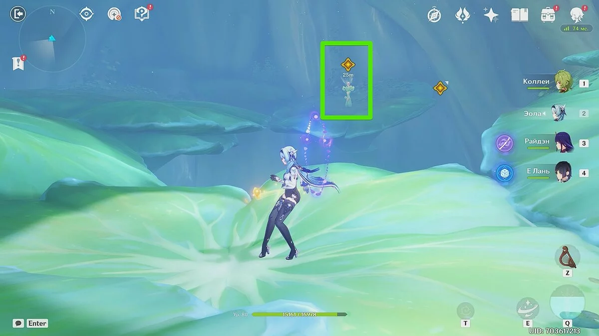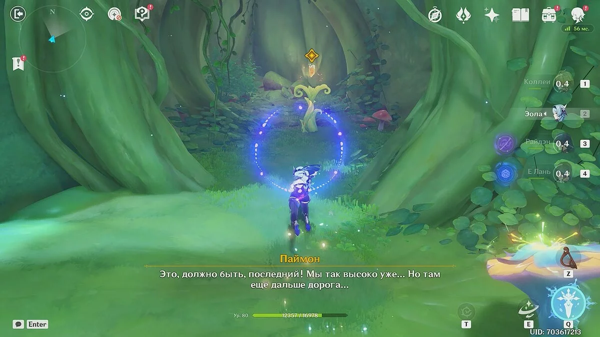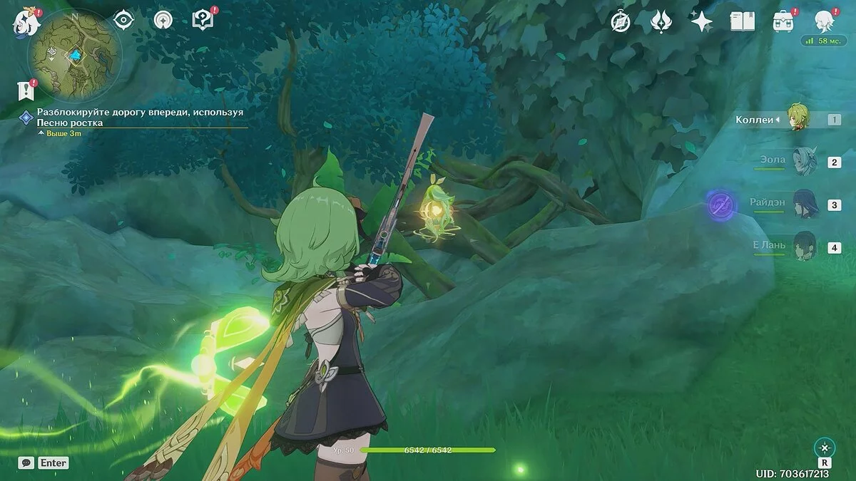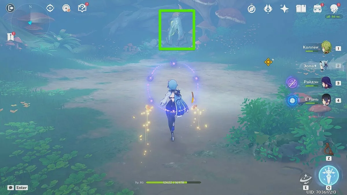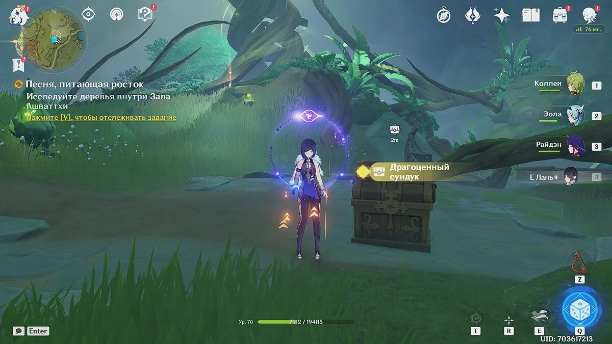 Подпрыгиваем на нём, затем используем стихию Дендро на бутоне и создаём четырёхлистный символ. Но сперва забираем второй янтарь и осматриваем драгоценный сундук после победы над монстрами.