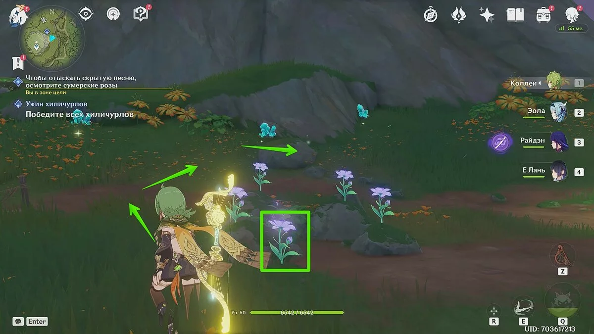 Телепортируйтесь к Склону Гандха и побеседуйте с Арамой. В каждом задании этой цепочки вам нужно осматривать сумерские розы и искать скрытые песни. Делается это следующим образом: