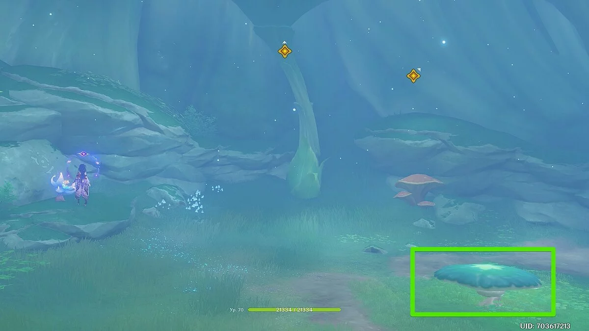 Появится Арама и перенесёт вас в подземелье. Активируем цветок и спускаемся вниз. Сражаемся с монстрами и подбираем первый янтарь. Следуем по пещере вперёд, убиваем врагов и взаимодействуем с очередным цветком. В центре локации появится гриб-батут.