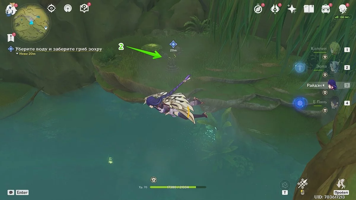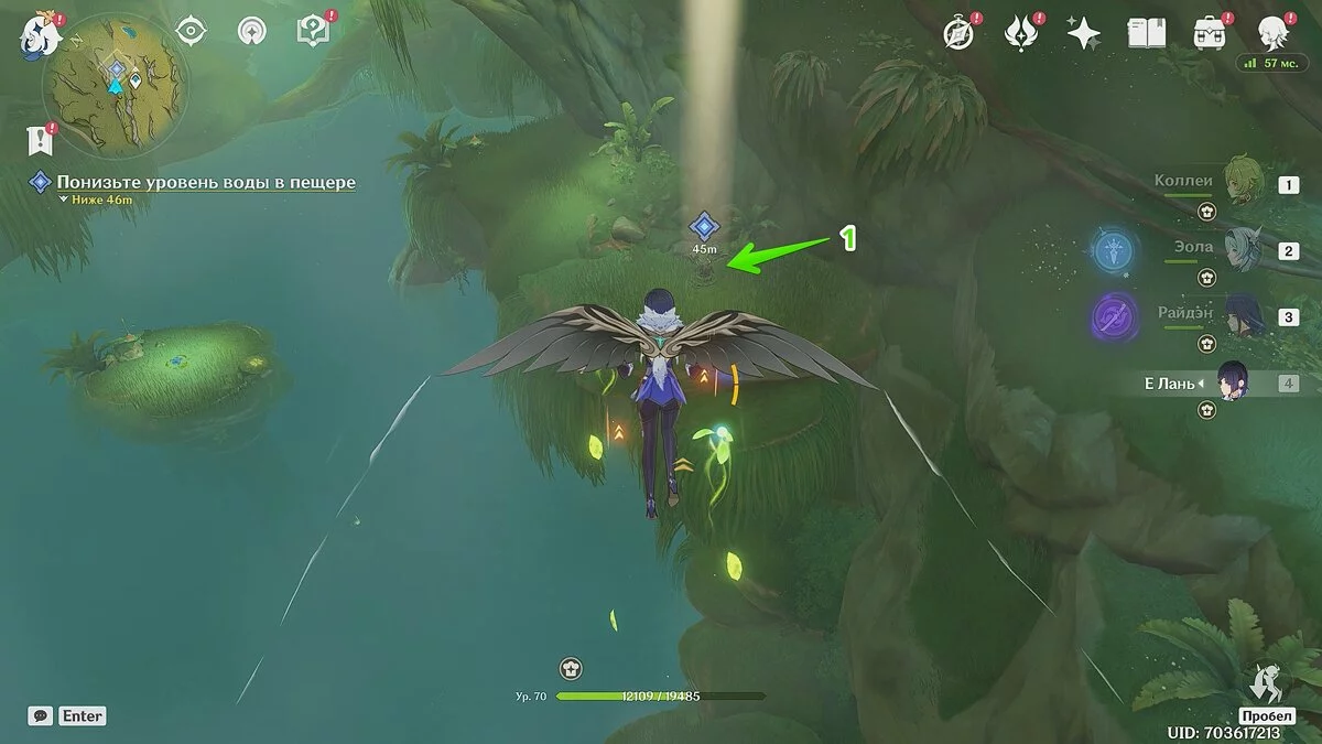 В первую очередь в пещере нужно активировать все бутоны и создать четырёхлистные символы. Найдите и взаимодействуйте с двумя монументами. Вода уйдёт, а вы сможете продолжить поиски.