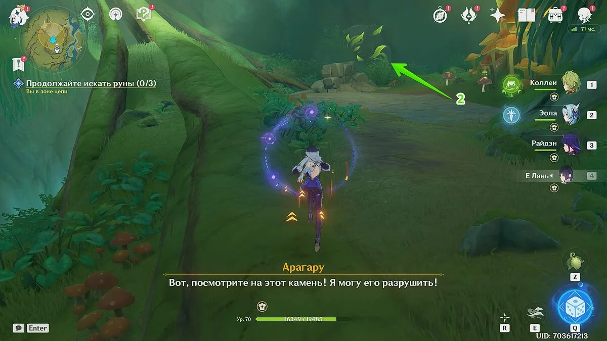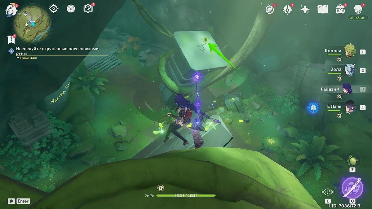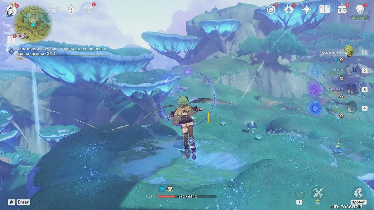 Теперь примените на монументе элемент Дендро. Если вы участвовали в ивенте «Детская сказка» и завершили квест «Отвергнутая игрушка», то в вашем распоряжении должна быть героиня Коллеи. С её помощью вы расчистите вход в пещеру и получите достижение «Горький плод мечты».