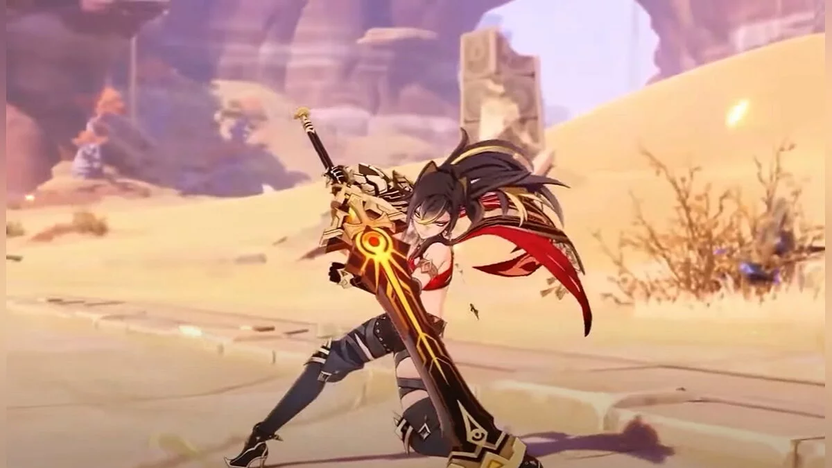 Дэхья пользуется двуручным мечом, а её атаки усилены Пиро-стихией. Она наносит огромный урон, который может быть увеличен ещё сильнее при взаимодействии с другими элементами. Помимо этого девушка может впитывать входящие атаки противников без вреда для собственного здоровья. Благодаря этому вы можете обойтись без щитовика. Вместо него в команду можно взять другого персонажа.