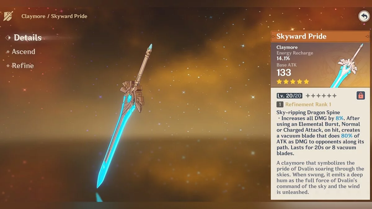 «Небесное величие». Пятизвёздочный меч, который обладает атакой 48-679 единиц и бонусом к восстановлению энергии в размере 8-36,8%. Во время ударов этим оружием ваш урон повысится ещё на 8-16%. После активации взрыва стихий каждая обычная или заряженная атака будет запускать лезвие, которое наносит 80-160% от вашей базовой атаки. Длительность эффекта — 20 секунд. Но он прервётся, если вы за этот временной период успеете выпустить 8 лезвий. Чтобы получить «Небесное величие», воспользуйтесь молитвами «Воплощение божества» или «Жажда странствий».
