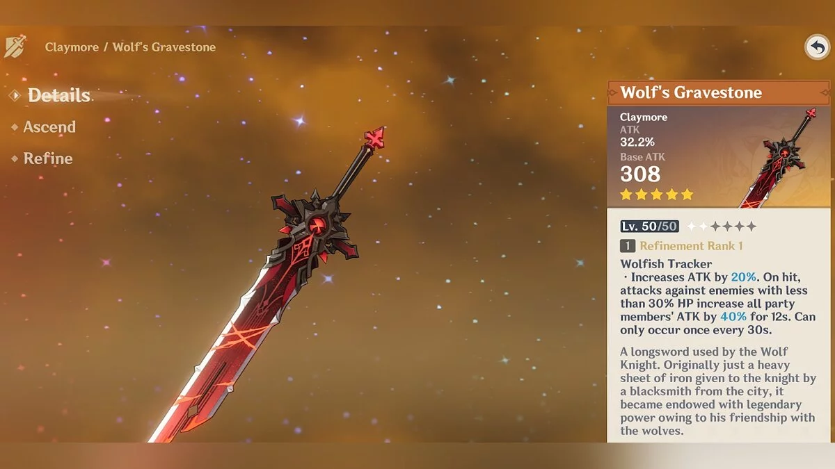 «Волчья погибель». Пятизвёздочное оружие с огромным уроном, которое особенно эффективно во время финальных фаз сражений с боссами. Его базовая атака составляет 46-609 единиц, но она увеличивается дополнительно на 10,8-49,6%. Плюс, этот меч даёт дополнительный бонус к урону в размере 20-40%. Если вы попали по противнику, у которого меньше 30% здоровья, сила атаки всех бойцов в вашей команде увеличится на 40-80% в течение 12 секунд. Эффект может возникнуть 1 раз в 30 секунд. Получить «Волчью погибель» можно при помощи молитв «Жажда странствий» и «Воплощение божества».