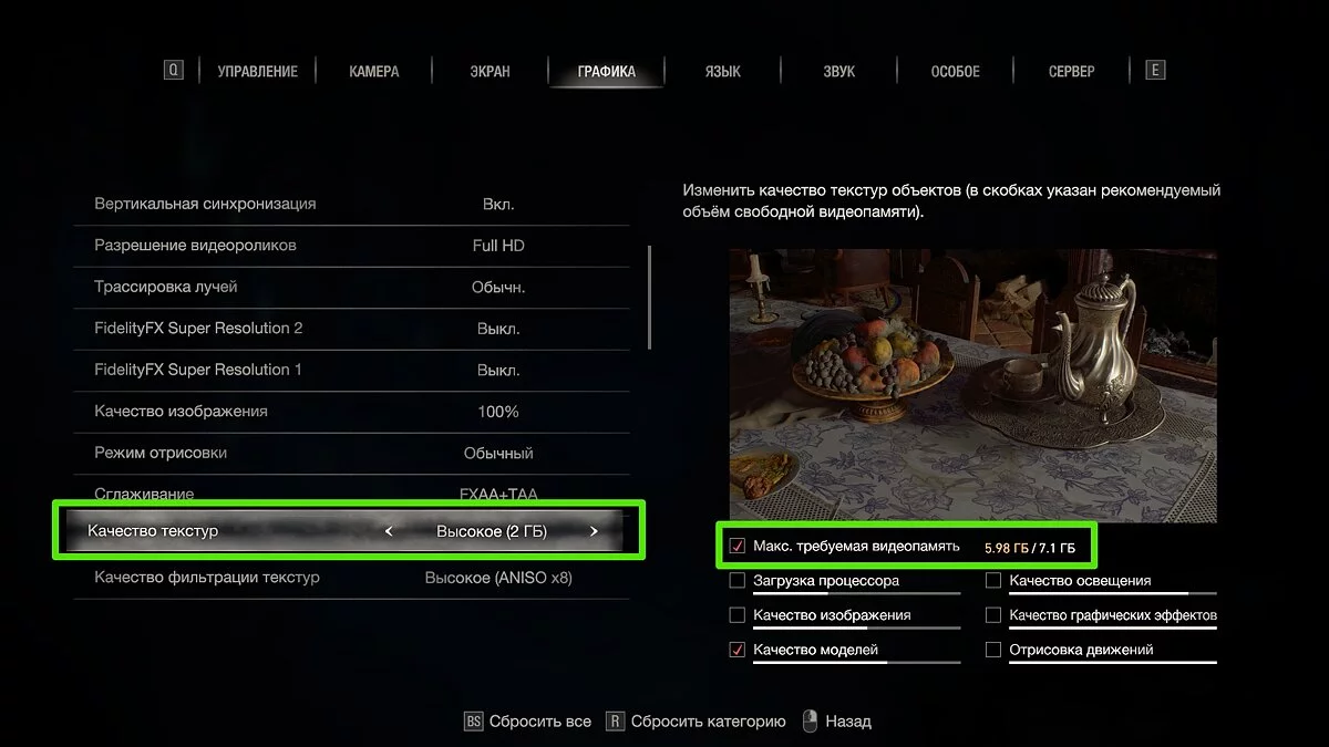 Откройте игру и перейдите в раздел «Настройки». В пункте «Графика» выставьте значения для уменьшения потребления видеопамяти. Отследить его можно в правом углу экрана.