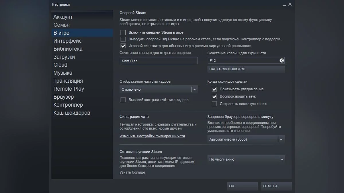 - Уберите галочку с параметра «Включить оверлей Steam в игре» и нажмите «ОК».