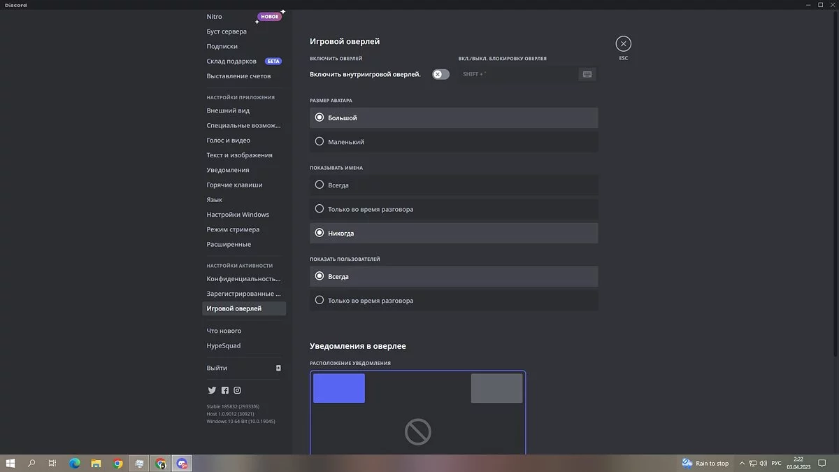 - Переведите флажок в положение «Выкл» рядом с параметром «Включить внутриигровой оверлей».
