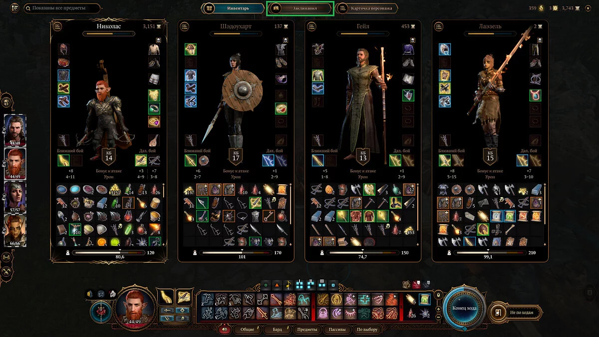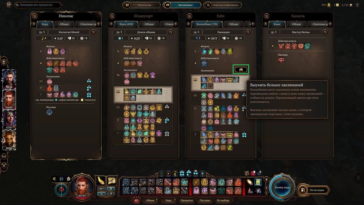 Если вы видите множество заклинаний, но не можете выучить их, сделайте активным персонажа-волшебника, откройте инвентарь и перейдите на вкладку «Заклинания». В таком случае в списке будут лишь те чары, которые еще неизвестны персонажу.