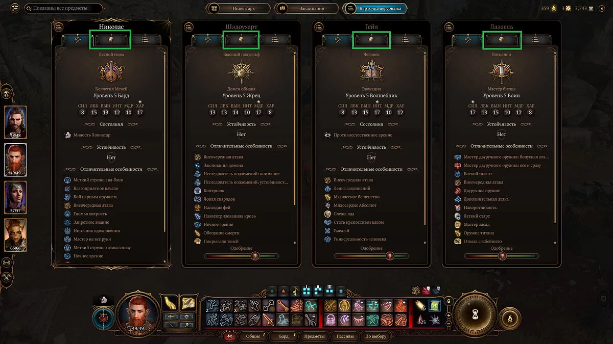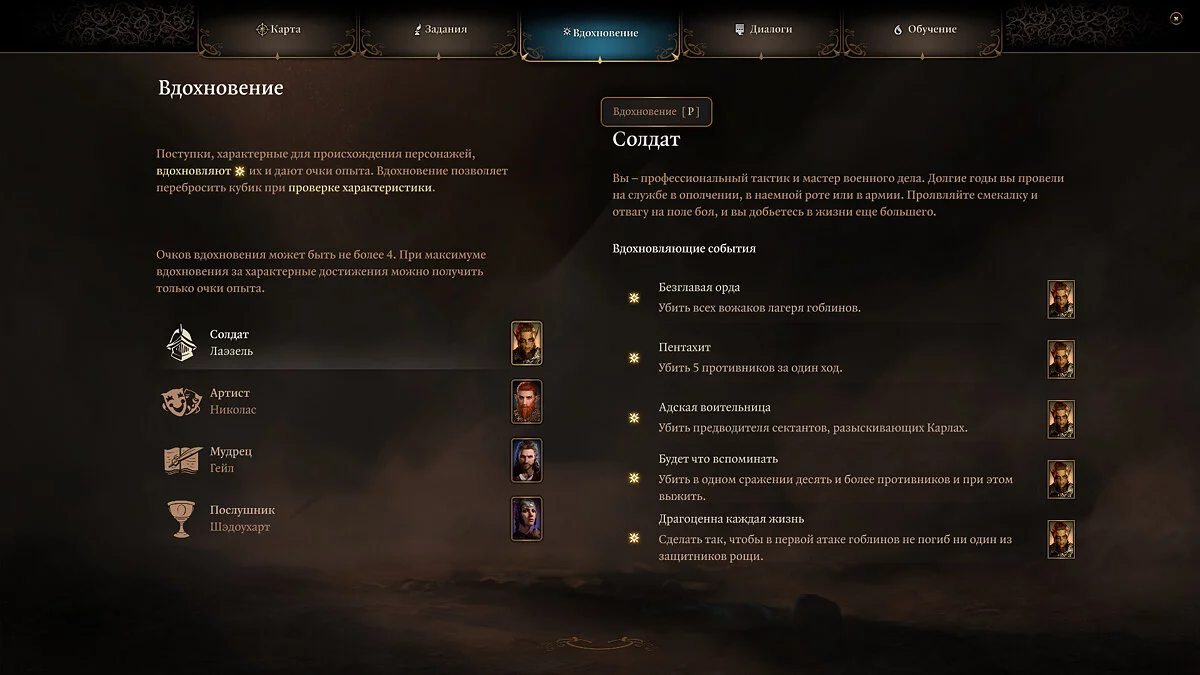 Например, Лаэзель может получить вдохновение, убив пятерых врагов за ход, а Актер вдохновится хорошим выступлением барда. Всего можно накопить 5 очков Вдохновения. Лишние заряды превратятся в очки опыта. Посмотреть текущие заряды можно на вкладке «Вдохновение» (P).