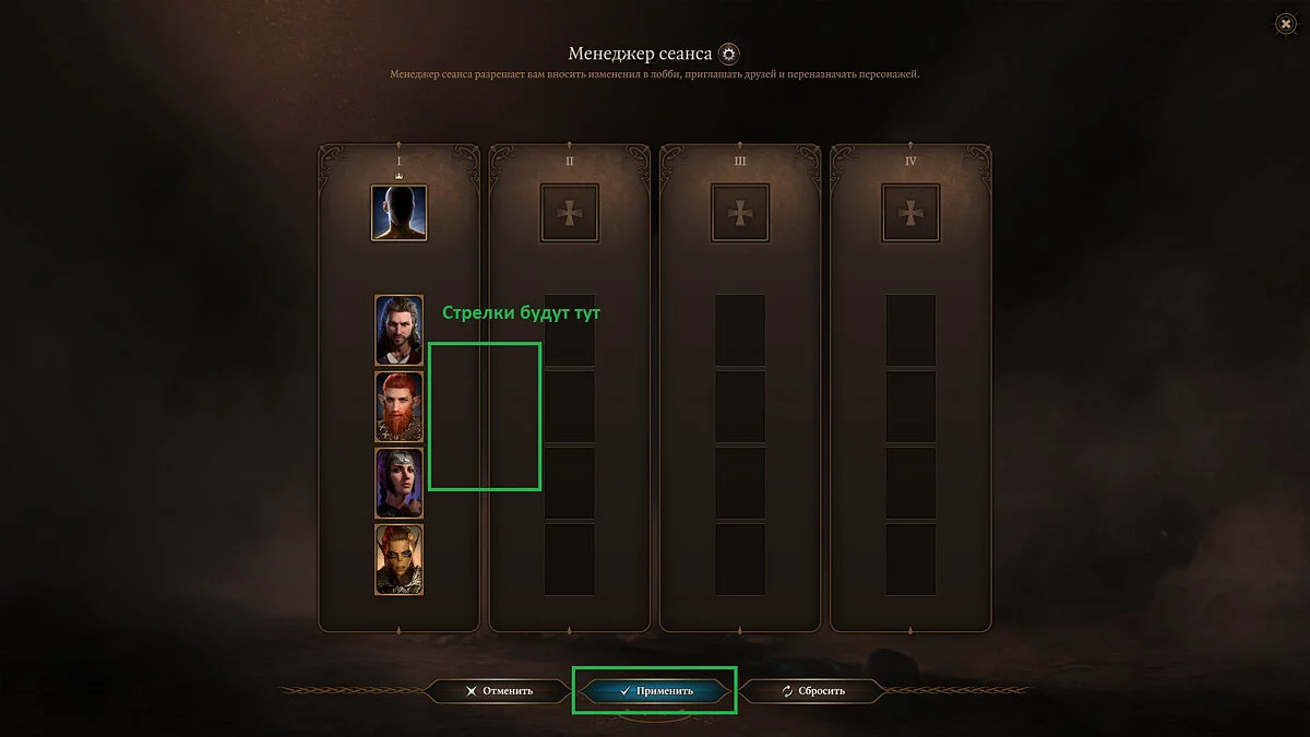 - Используя стрелочки, хост (владелец) партии может переназначить персонажей на различных игроков;