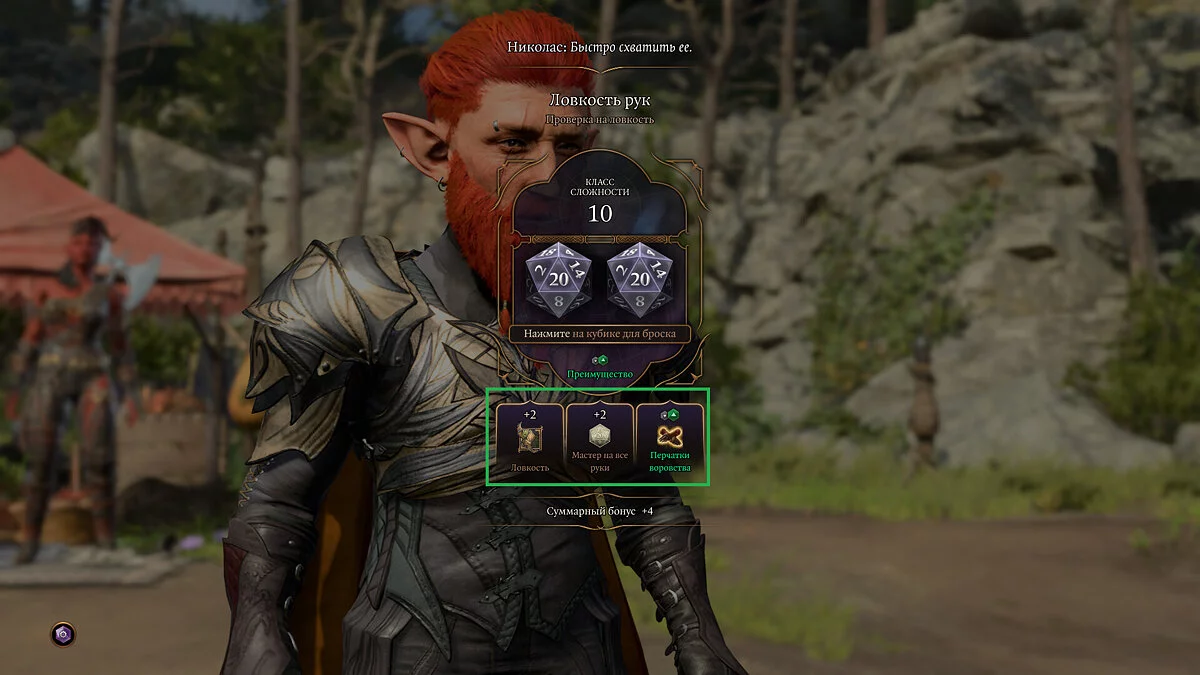 Здесь в дело вступают характеристики. В зависимости от ситуации и навыков вашего персонажа, «+3» может смениться и на «+7», и на «+15». Например, мы играем за Плута, который хорош во взломе замков и хотим вскрыть сундук.
