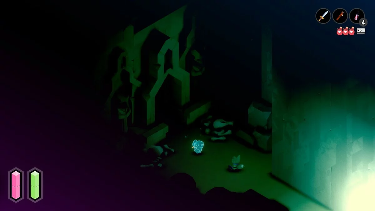 Без исследования мира в TUNIC не обойтись. Часть полезных расходников можно купить у скелета-торговца, однако на всё ресурсов не хватит, да и не каждая ценность есть в продаже.