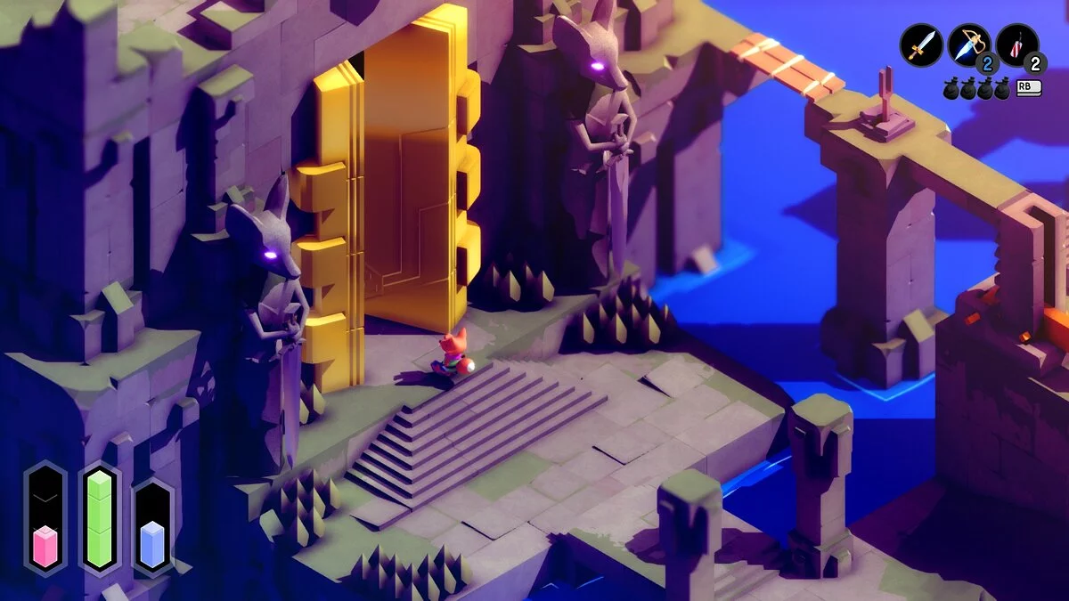 Фишка в том, что TUNIC построена по принципу метроидвании. Поначалу большая часть проходов закрыта — чтобы добраться до них, придётся найти нечто важное. Учитывая, что лис начинает прохождение с пустыми руками, ему много что понадобится.