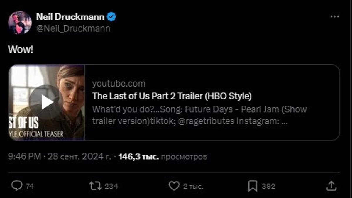 Не обійшов стороною фанатське творчість і Ніл Дракманн (Neil Druckmann), сценарист оригінальної The Last of Us Part 2. Він запостив ролик до себе на сторінку, супроводивши коротким підписом «Вау!».